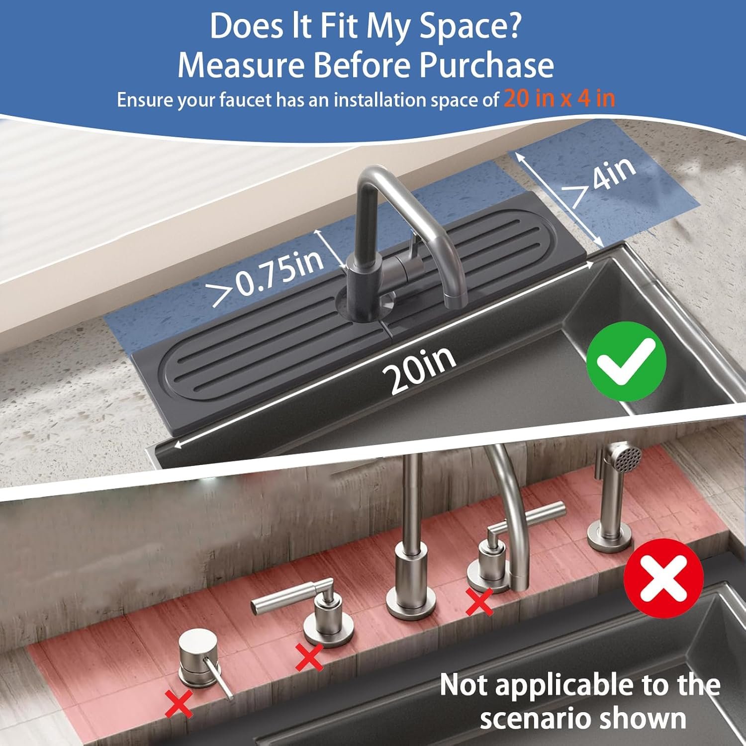 IMPORTANT!Before Purchasing —(1)Based on the product size, make sure the stone faucet mat won’t cover any sink buttons or dispensers. (2)Faucet-to-wall distance must be over 0.75″.(3)Faucet base diameter must be under 2.5″. 【Product Size: 20″ x 4″, with a 2.5″ center hole, NON-CUTTABLE HARD STONE MAT!】