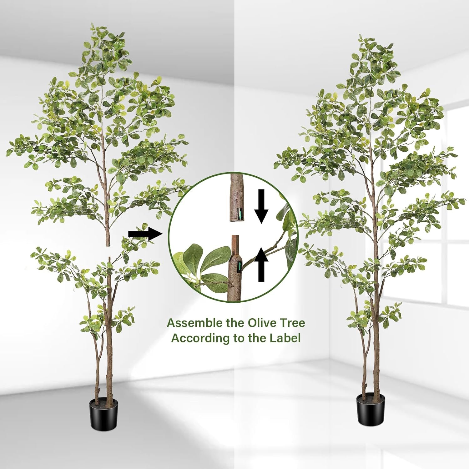 Easy to Assemble: Olive tree artificial is 7FT high, the black flowerpot is 6.7in high and 5.7in wide. When you receive an olive tree, it is divided into two parts. The main trunk is pre assembled in a heavy-duty flowerpot made of plastic and concrete. Please splice the branches and trunk together according to the stickers on the trunk. This tree is equipped with a non decorative flower pot. It is recommended that you place this tree in a decorative flower pot for a better decorative effect