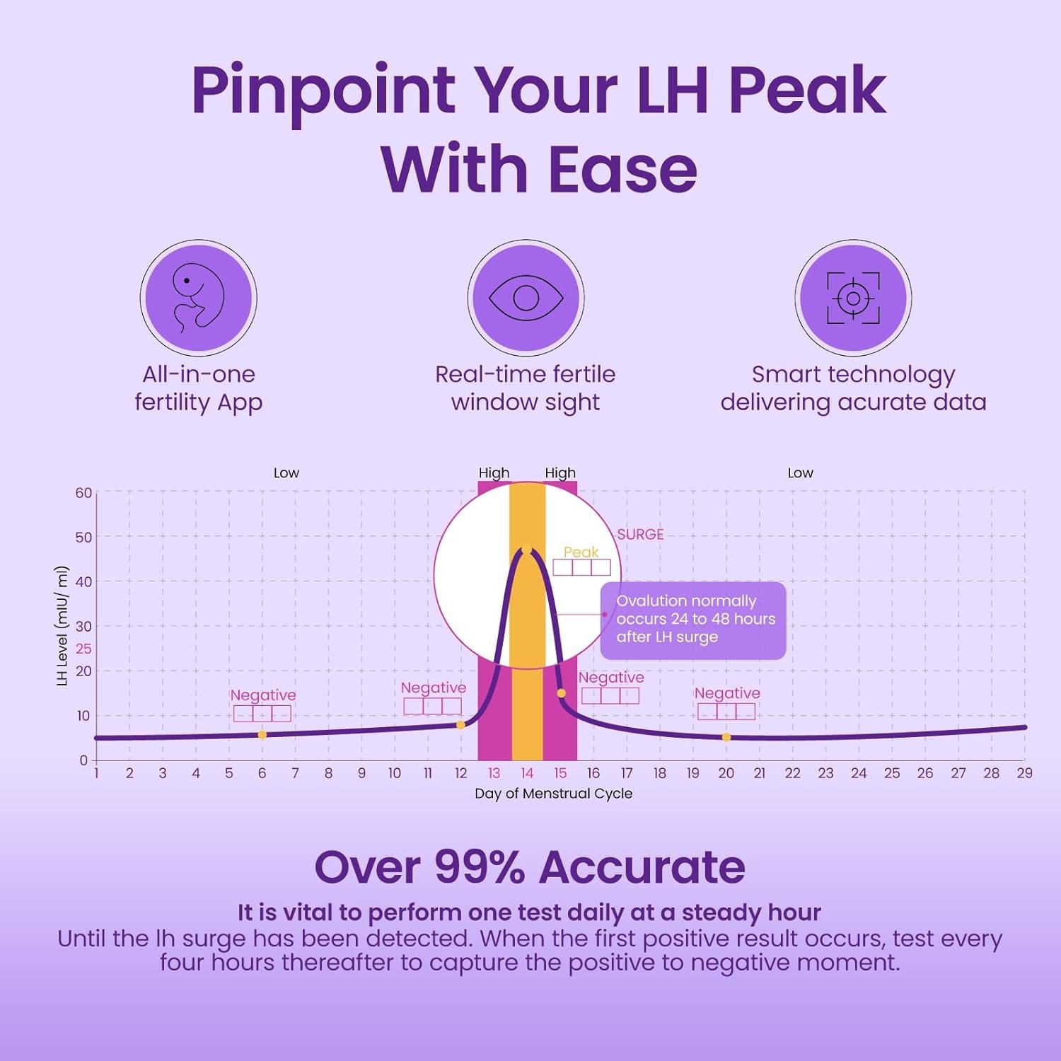 Over 99.5% Accurate Test Result: Femometer ovulation test kit guarantees over 99.5% accurate test result. Fertility test strips give women trying to conceive a greater chance of tracking their LH hormone levels and predicting their most fertile days.