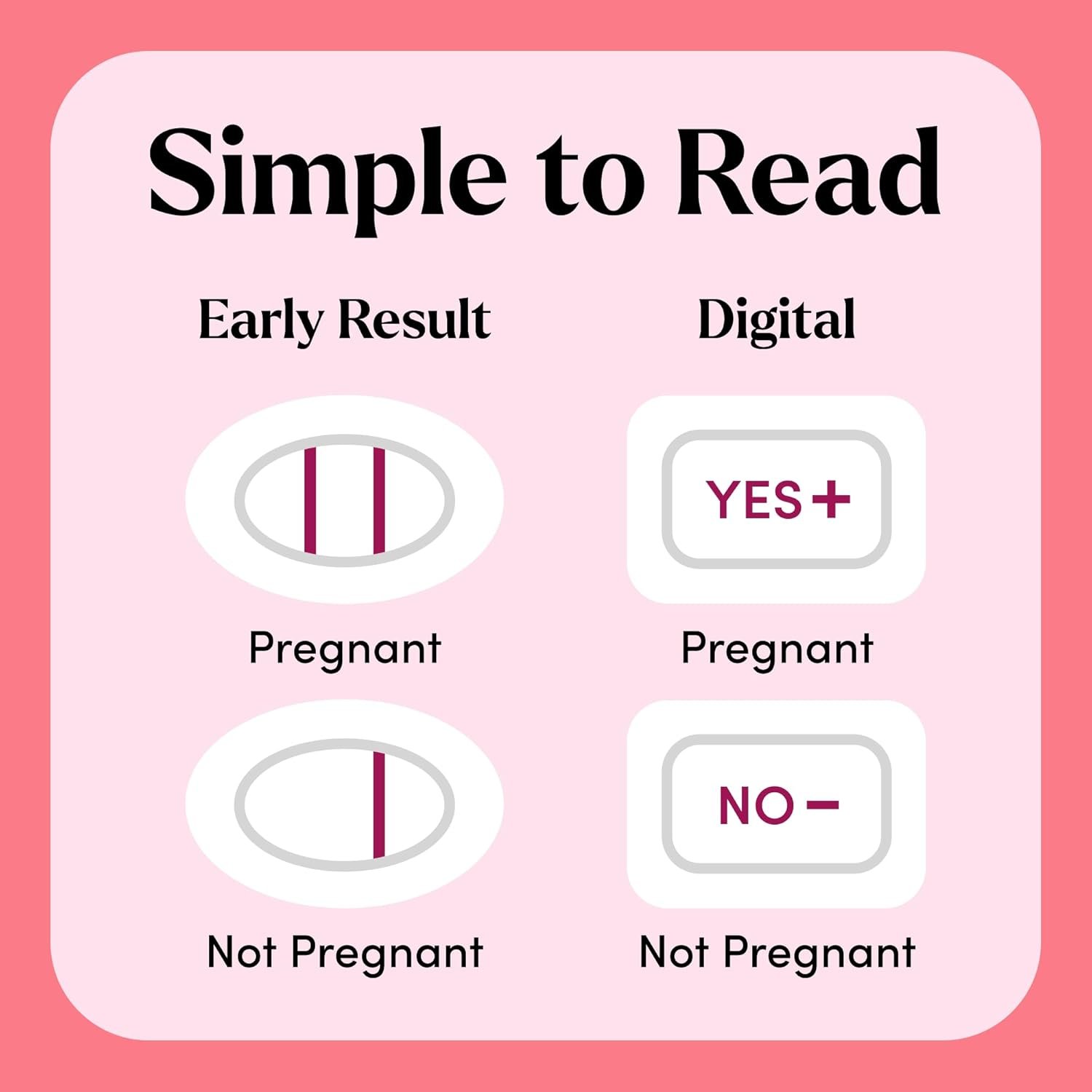 Easy-to-read results – Early Result: Two lines means pregnant and one line means not pregnant, Digital: YES+ / NO-