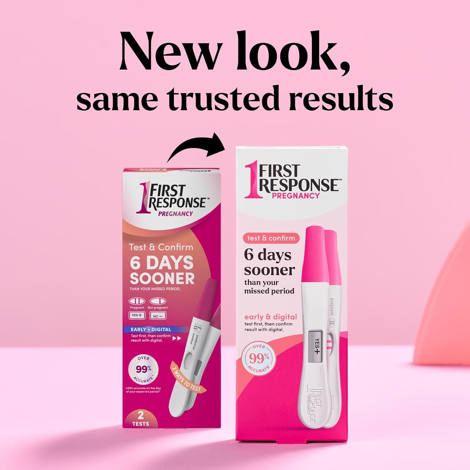 Test & Confirm your pregnancy test results 6 Days Sooner* with two different tests in one pack! Sensitive enough to capture scant amounts of the pregnancy hormone, First Response Early Result and First Response Digital pregnancy tests give you results 6 days sooner than your missed period.[1] First Response Early Result Pregnancy Test is over 99% accurate from the day of your expected period [2]. Result appears in 3 minutes. First Response Digital Pregnancy Test is over 99% accurate from the day of the expected period [2]. With First-to-Detect technology, it has an easy-to-read “YES+ / NO-” result and a unique “test is working” indicator that lets you know the test is ready for use. Result in just 3 minutes. [1] FIRST RESPONSE detects the pregnancy hormone 6 days sooner than the day of your missed period (5 days before the day of expected period). [2] >99% accurate at detecting typical pregnancy hormone levels from the day of your expected period. Note that hormone levels vary.