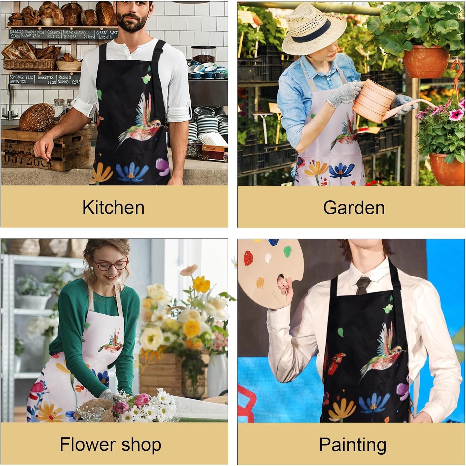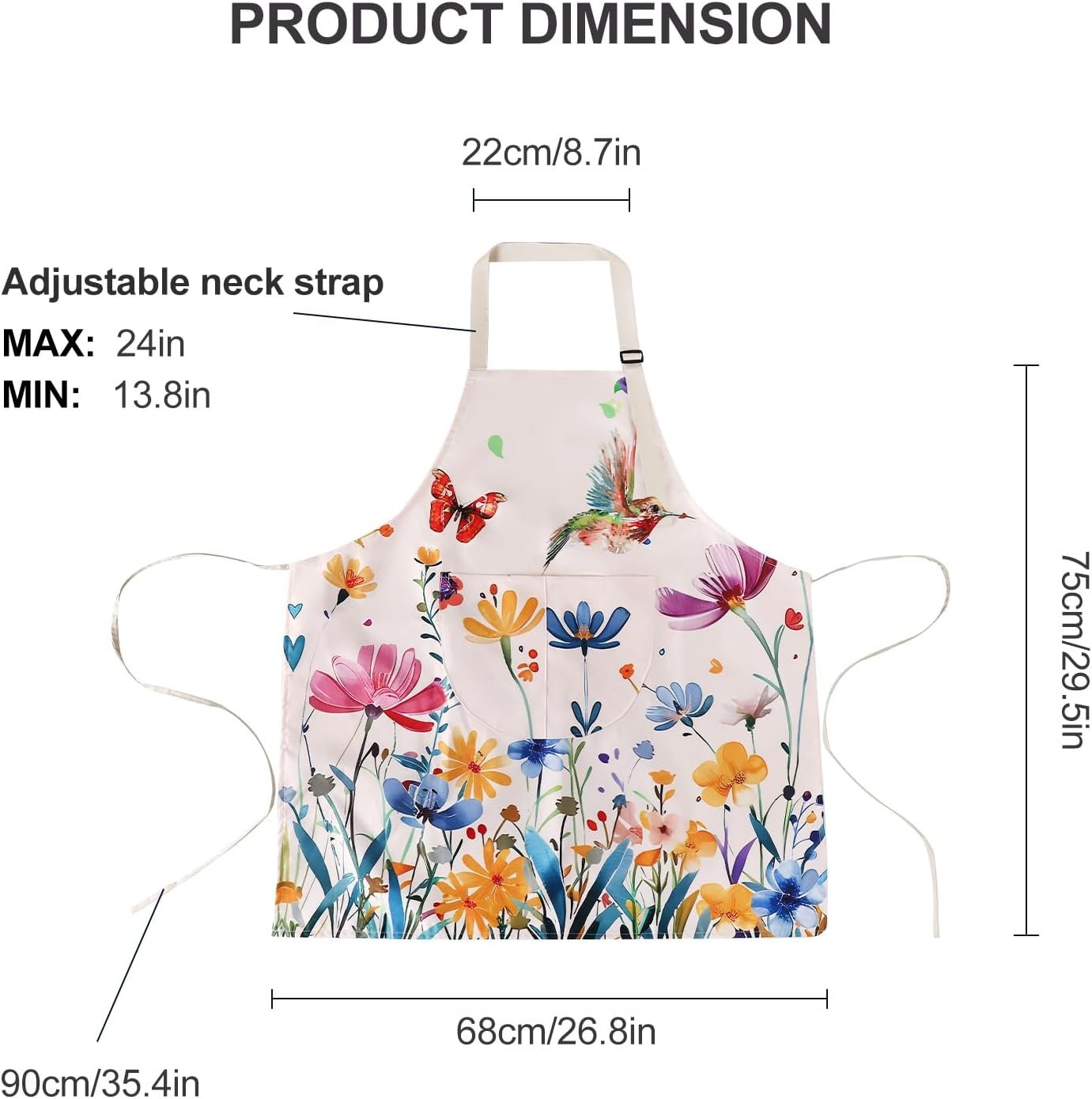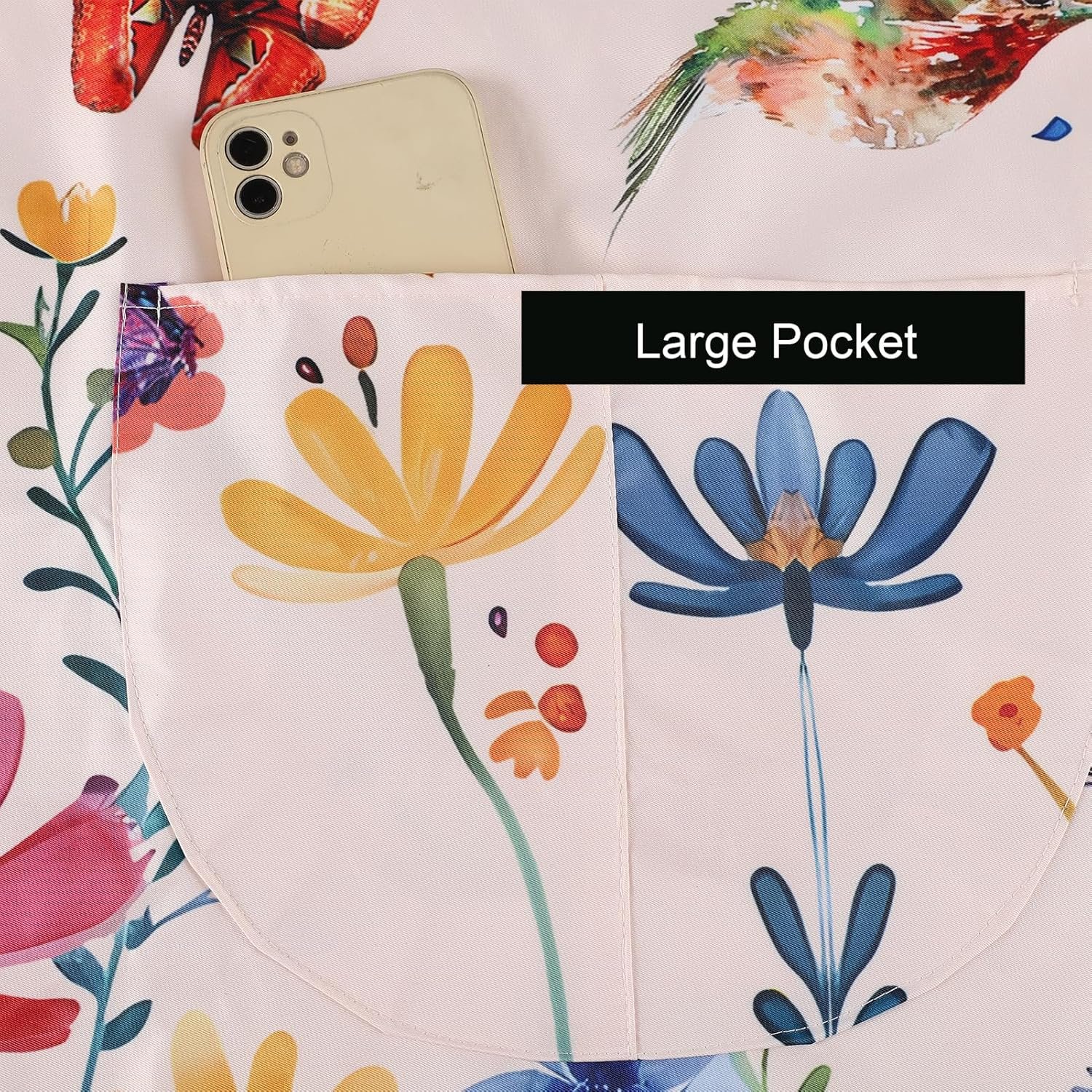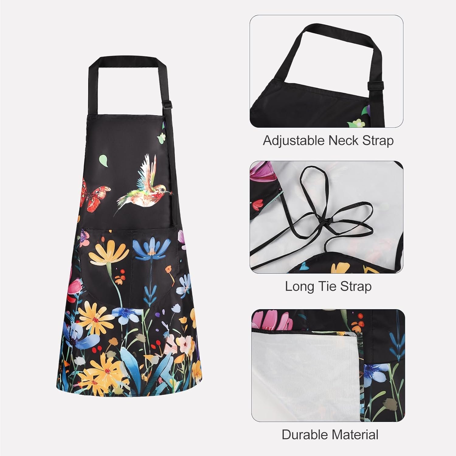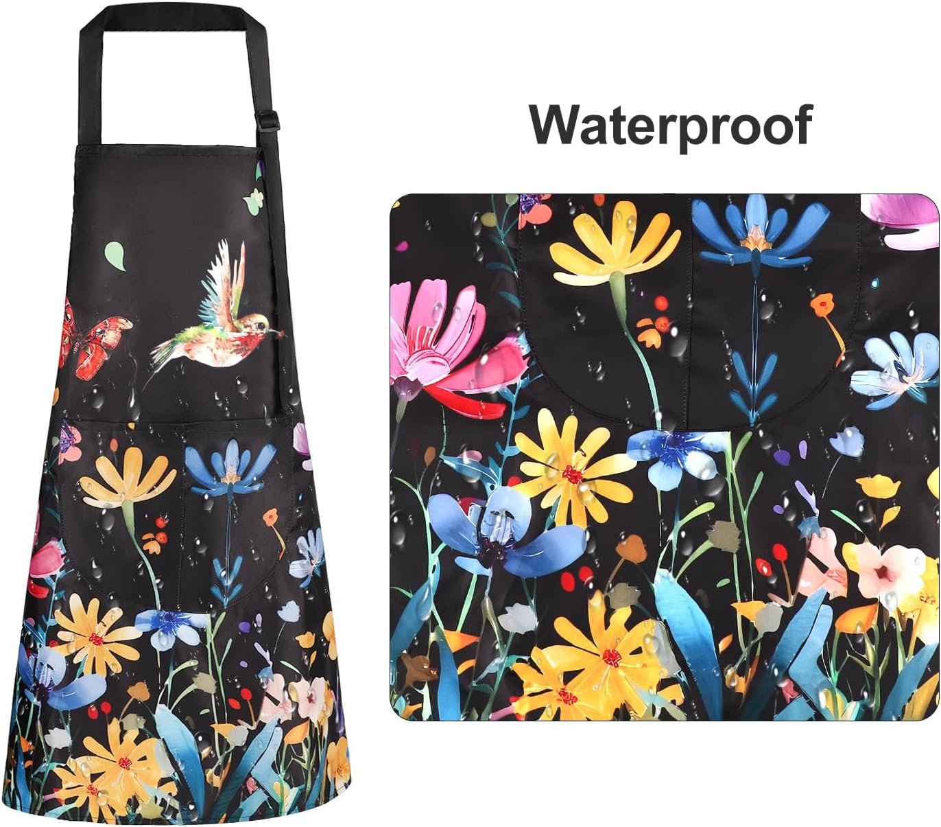 These cute aprons are made of waterproof fabric with white backing. 3D digital printed flower butterfly bird printing. No color fading problem.