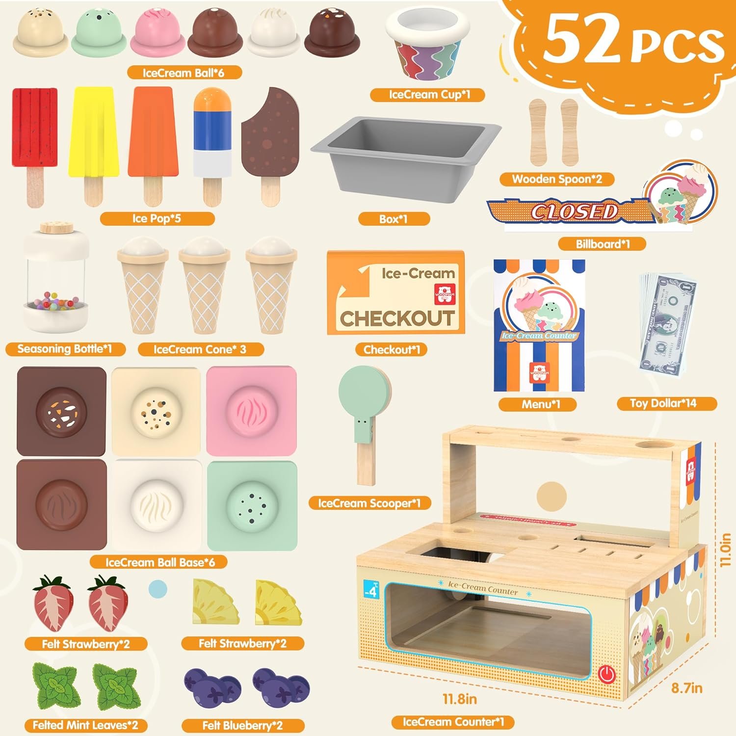 【52-Piece Complete Playset】Everything your child needs to run a vibrant ice cream shop is right here! The ice cream pretend play toy includes a wooden ice cream scoop, colorful cones, delectable toppings, a handy menu, and realistic play money for hours of immersive, open-ended fun