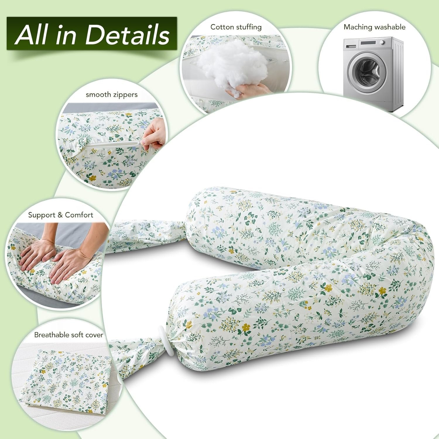 【Breathable, Soft & Removable Printed Pillowcase】Our bolster pillows come with pillowcases featuring cute floral patterns, are refreshing and pleasant, detachable, and machine washable. The lid of this round cylindrical pillow is soft and breathable, keeping you cool and comfortable throughout the night.