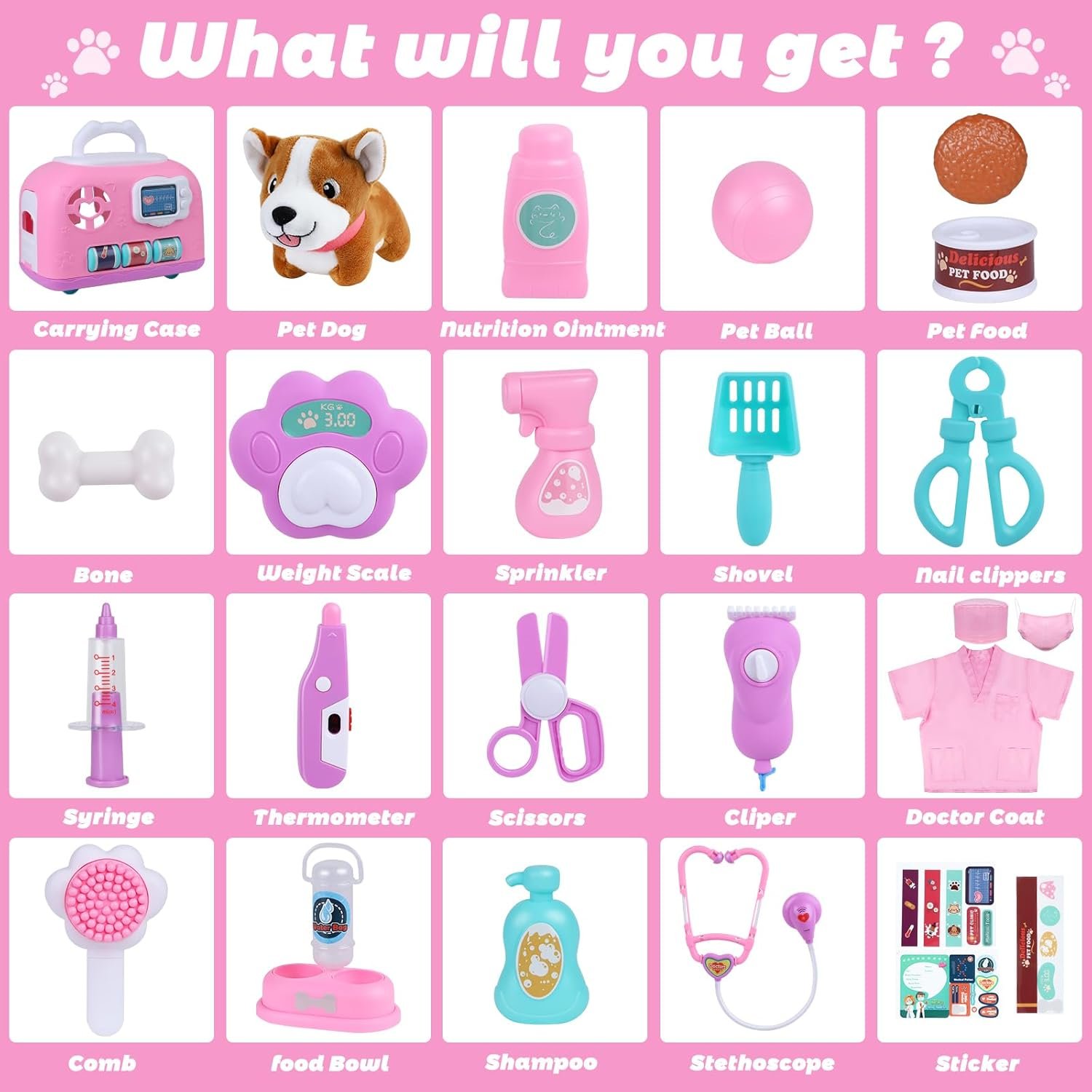 【Complete Vet Kit Accessoriesfor Kids】This play pet veterinary set is a 23 pieces with doctor coat and hat, a plush dog, stethoscope, syringe,thermometer, scissors,cliper,weight scale,sprinkler,shovel,comb,shampoo,nutrition ointment,food bowl, pet food,dog bone,pet ball,stickers and a carring case.