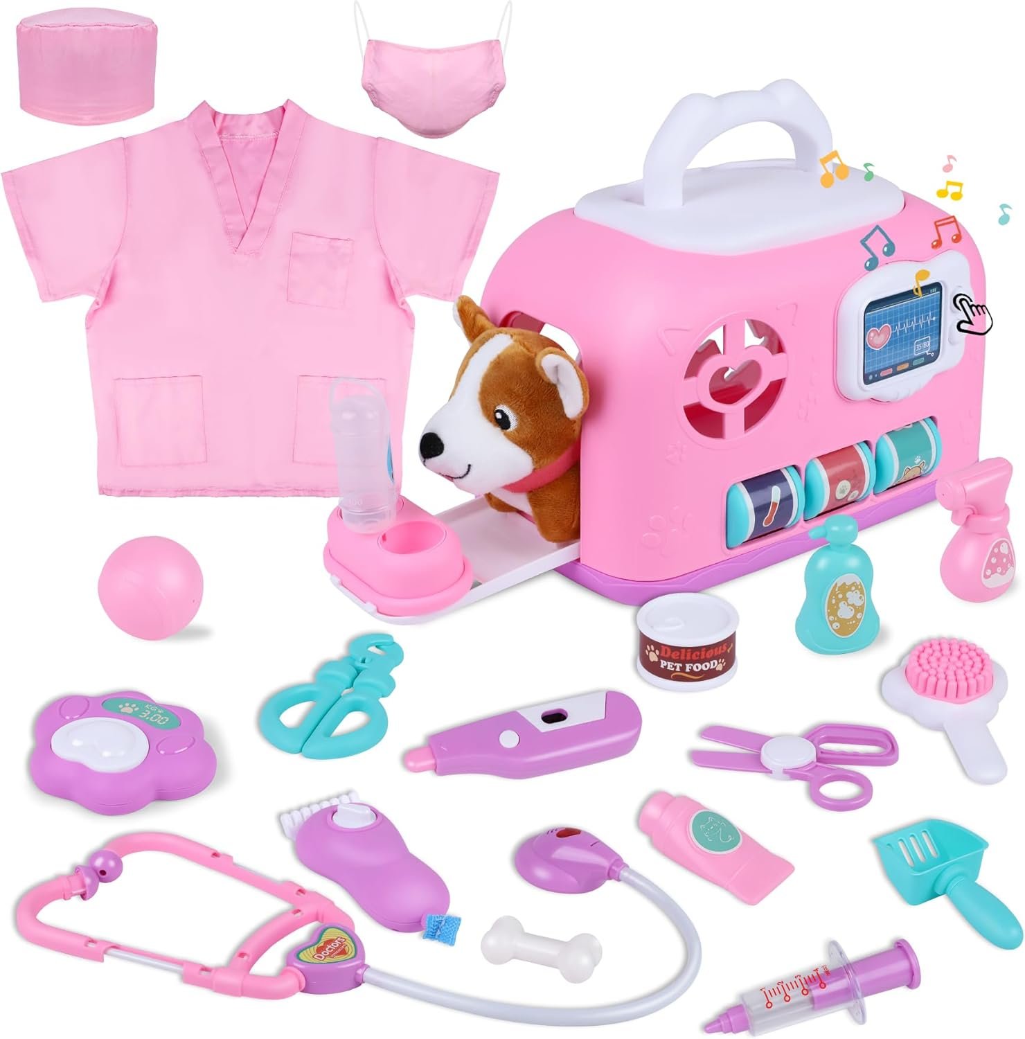 【Premium Quality】The doctor pretend play toy is made of environmentally friendly and child-safe plastic, is easy to clean for the utmost hygiene.The pet carrier pretend toys desgin with smooth and rounded edges,and the plush dog is smooth and soft to touch for kids.