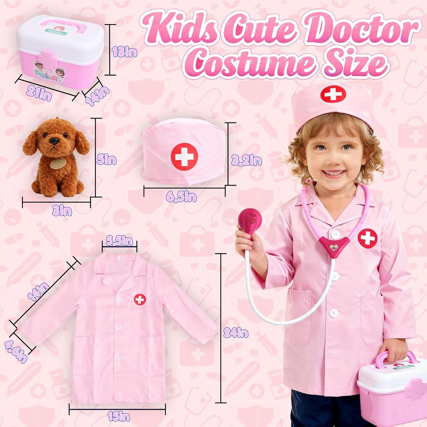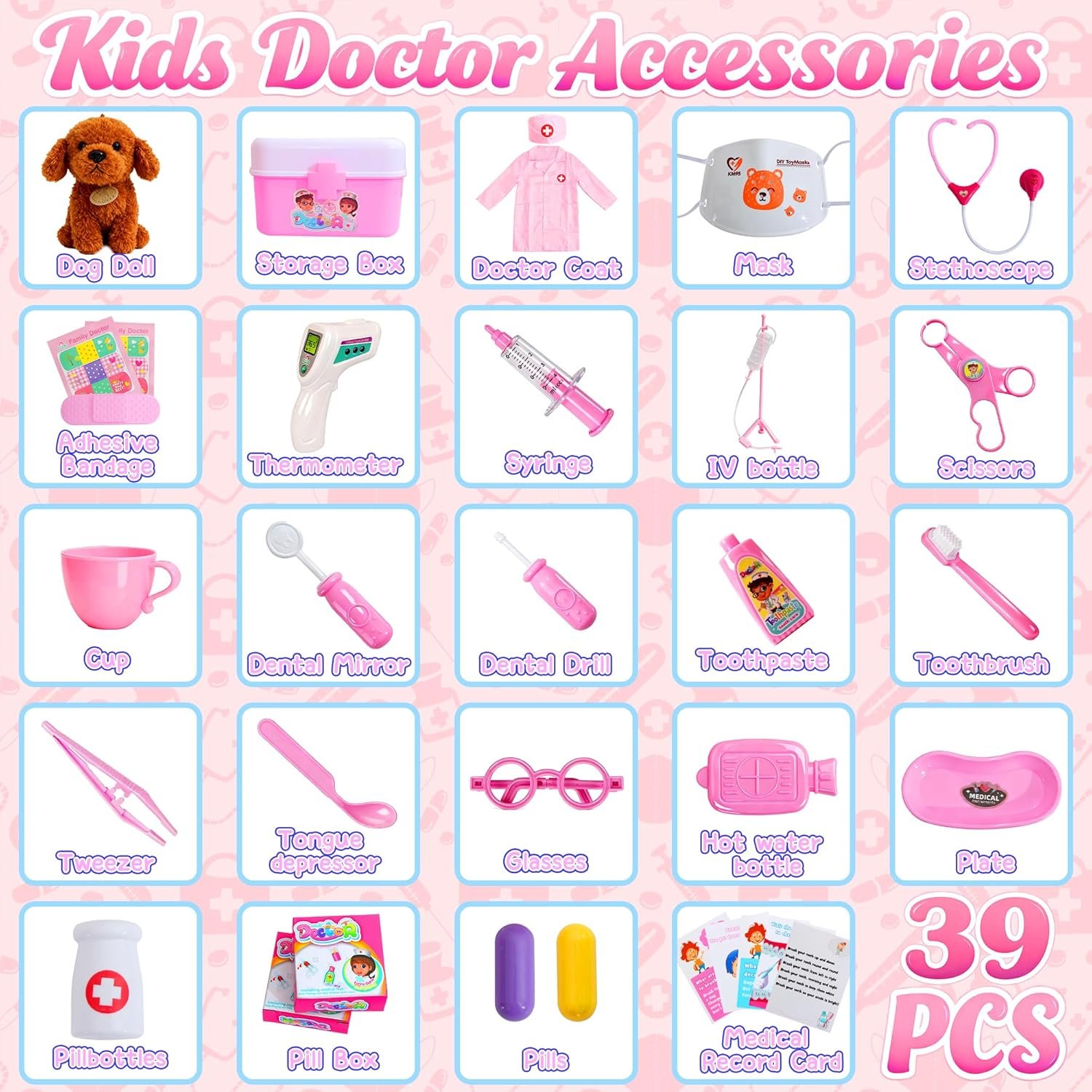 Doctor Kit for Girls with Soft Plush Dog Toy – This 39pcs pretend play toys set includes every essential tool for little doctors and veterinarians: a soft plush dog, doctor coat and hat, heartbeat-sound stethoscope, syringe, thermometer, tweezers, tray, scissors, eyeglasses, and a handy carrying box. A perfect starter medical and vet kit for toddlers who love to pretend play and dream of becoming caring little doctors.