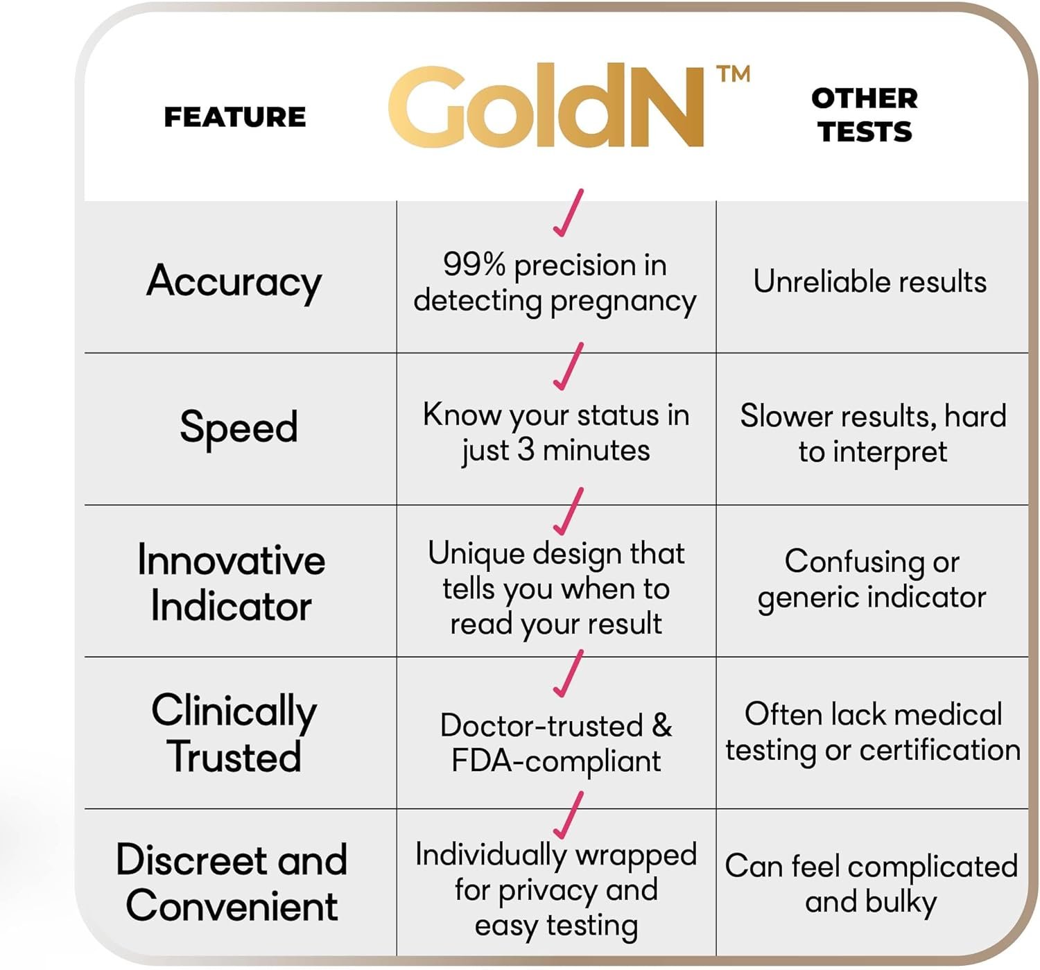 Over 99% Accurate, Even for Early Detection: GoldN detects HCG levels with clinical-grade precision, helping you know your pregnancy status with confidence—even before your missed period. Trust what your body is telling you