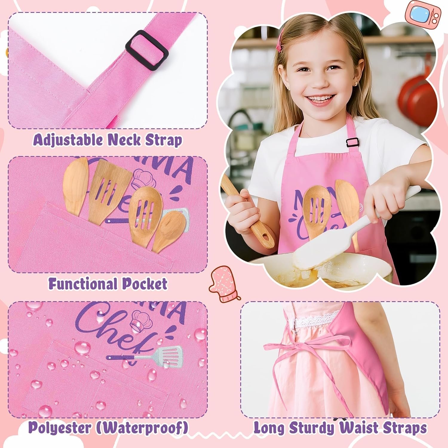 Adjustable & Functional: The apron is designed with strap adjustment to adjust to body size, and the apron features an adjustable neck strap and front pockets for kids to place baking, cooking, painting, and crafting tools.