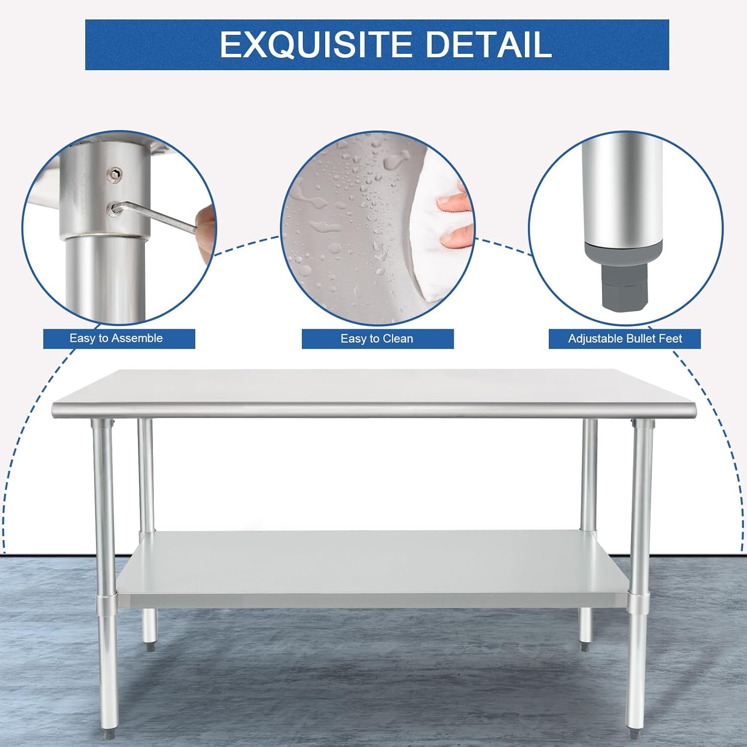 【HIGH QUALITY MATERIAL】- Our safety NSF-certified commercial stainless steel table top shelf is made of durable 18-gauge 430 stainless steel, which is excellent resistant to corrosion and rust. The metal table can withstand the demands of a busy kitchen or industrial setting.