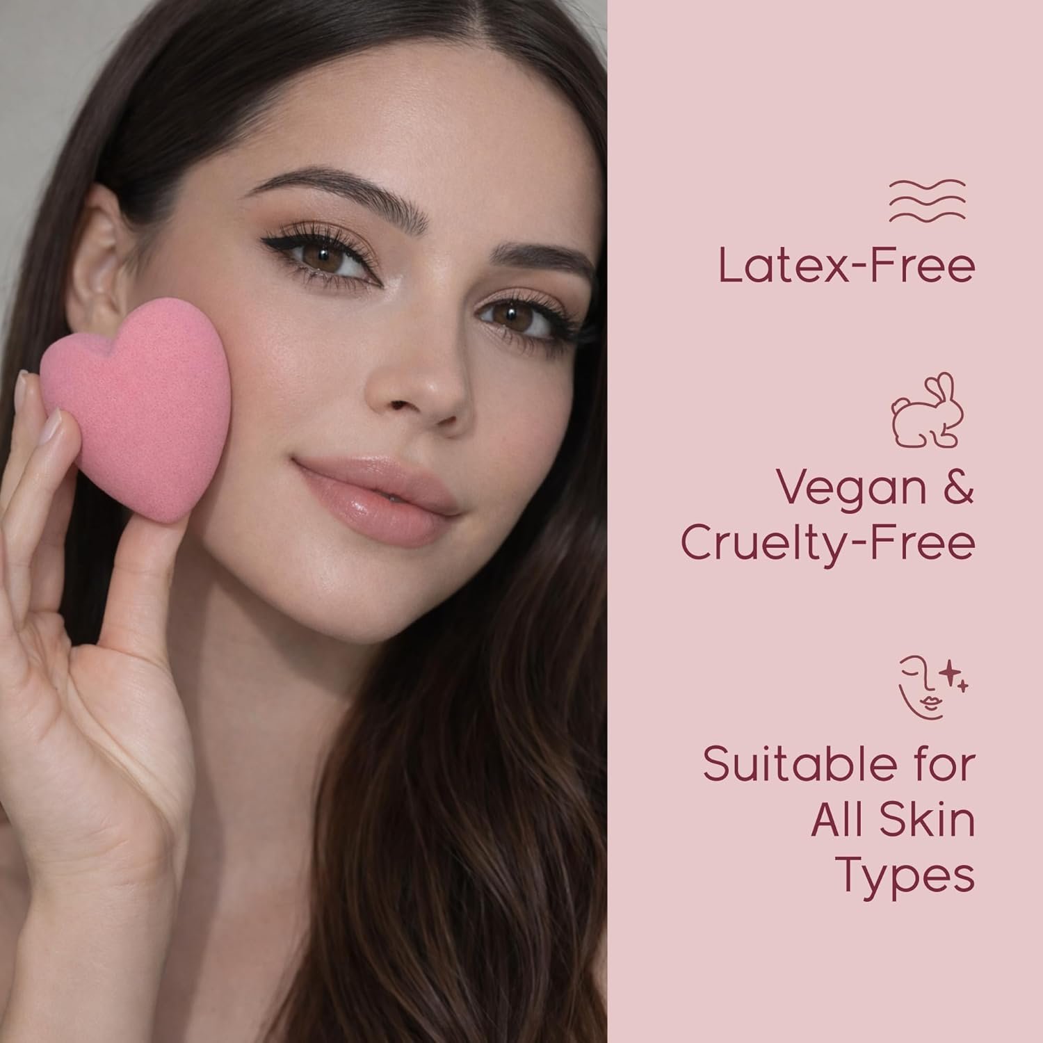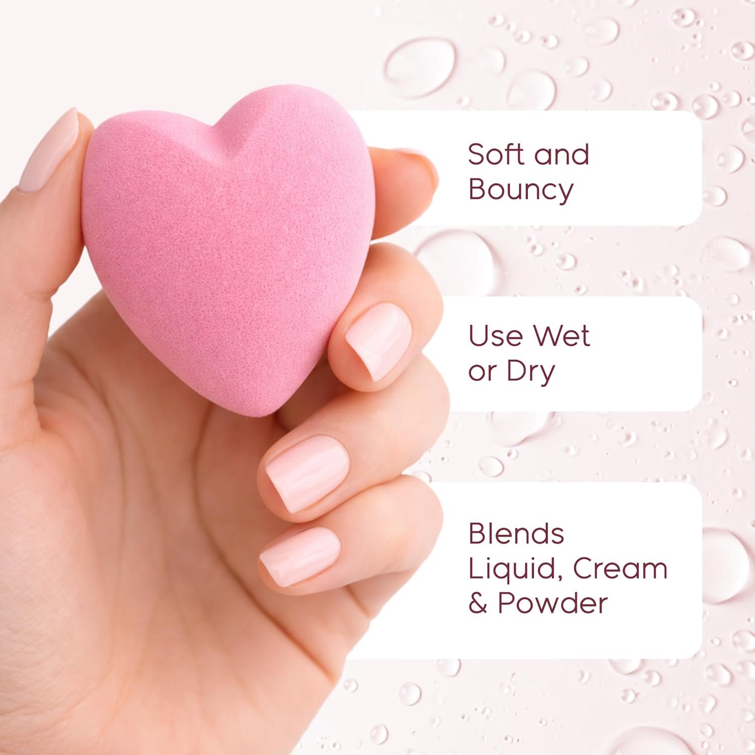 Fall in love with flawless blending. SweetHeart Sponge heart-shaped makeup sponges are soft, bouncy, and designed to blend liquid, cream, and powder formulas seamlessly for a smooth, airbrushed finish. The unique heart shape offers both precision and versatility. Rounded edges help blend larger areas of the face, while the tapered point allows for detailed application around the eyes, nose, and contours. Use the sponge damp for a natural glow or dry for fuller coverage. When wet, the sponge expands to provide effortless, streak-free results. This 6-pack is perfect for daily use, makeup lovers, and gifting. Vegan, cruelty-free, and latex-free.