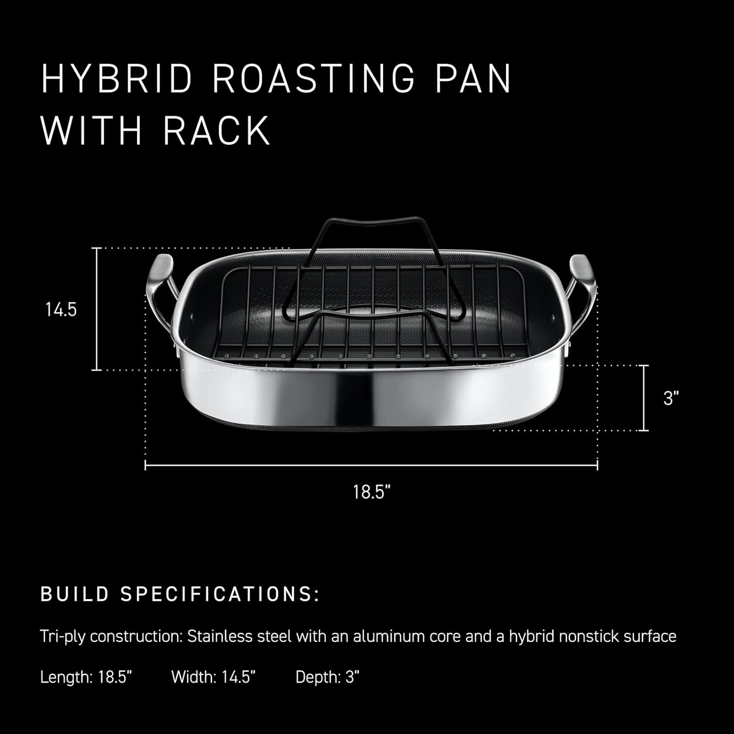 Your purchase includes one HexClad Roasting Pan measuring approximately 16.5 inches in length, 14 inches in width, and 3.5 inches in height. Included is a rack that prevents your roast from touching the bottom of the pan.
