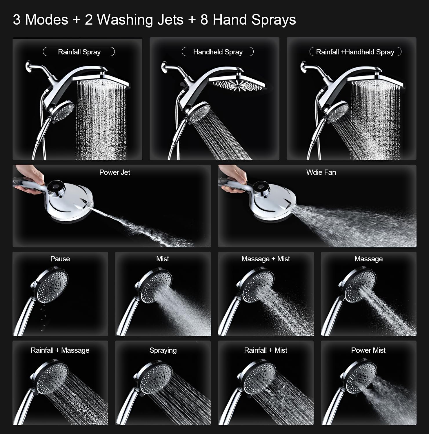Larger coverage shower heads with handheld spray combo, our large 12 inch square shower head allows for full body water coverage. Equipped with 10 spray settings hand held shower head, you can enjoy cozy showering, extra 2 different mode power jets can clean your pets or wash your bathroom and bath easily