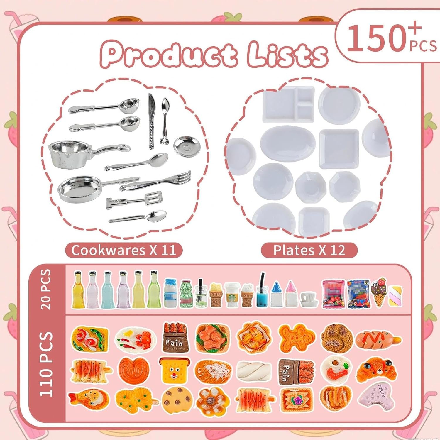 VALUE PACKAGE——resin food toys set includes 150 pieces different beautiful cute food toys, Include: food, beverage bottles, beverage cans, burgers, French fries, cakes, milk tea, bread, chocolate, ice cream, milk, beverages , kitchenware, tableware, etc. enough quantity and styles that can help to relieve stress, develop creativity and imagination, bringing you lots of fun