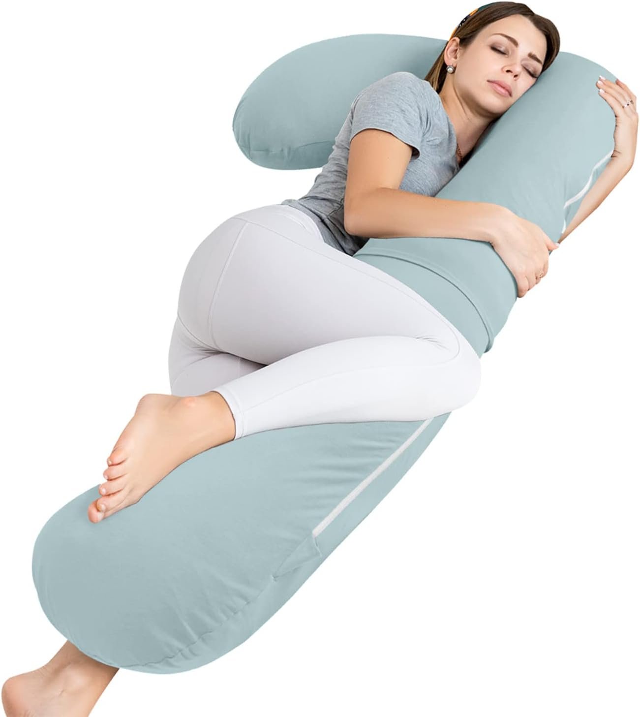 The pregnancy pillow is detachable that can be used as a V-shaped pillow and long bolster body pillow. The head part V-shaped pillow is suitable for the side sleeper. The long body pillow can be used as a leg wedge pillow that is placed between the legs.