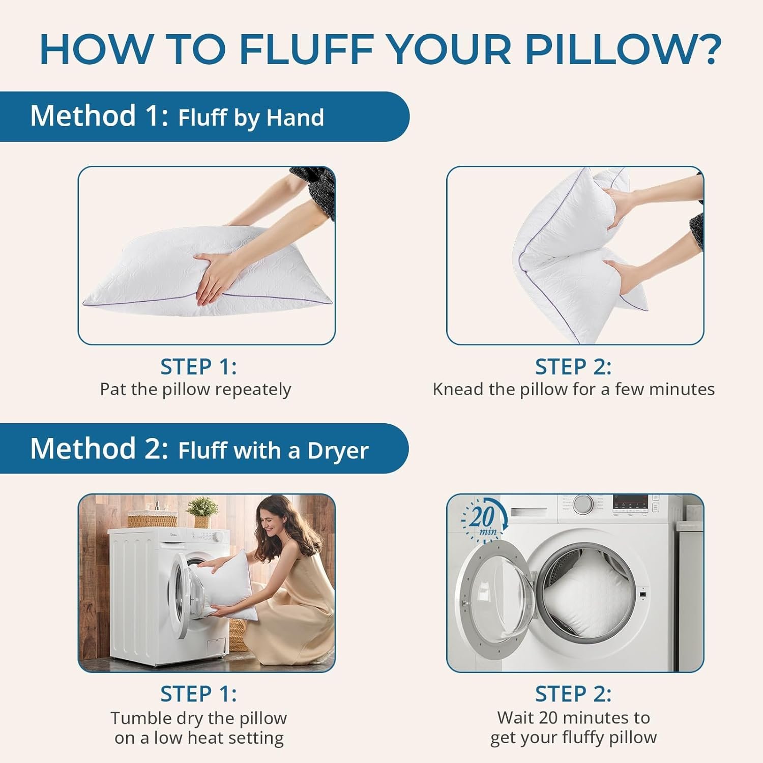 Pro Tip: Activate Fluffiness: Your pillows arrive vacuum-compressed. Skip the 48-hour wait! We suggest a 20-min tumble dry on low to instantly refresh the fibers. This secret step removes compression lumps and ensures perfectly plump support right away