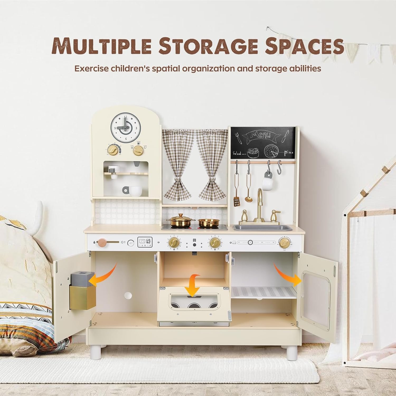 đSafety And Durability Guaranteed: Our wooden toy kitchen set is made of high-quality, child-safe materials and meets US ASTM F963 and CPSIA standards, ensuring a safe and durable play experience for your children. Our kitchen toy set adds an anti-tip design to ensure that the product will not tip over, protecting your child’s safety at all times!