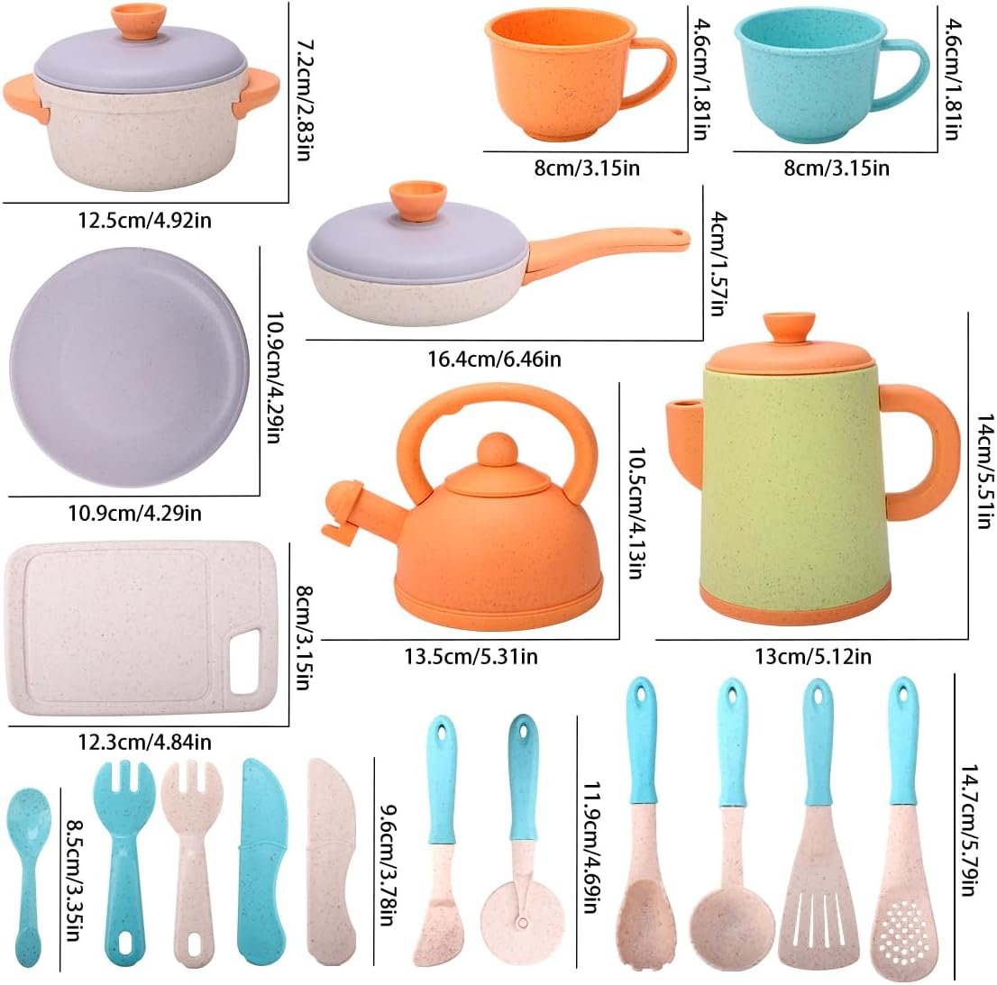 Complete Pretend Play Kitchen Set Includes pots, cups, plates, utensils and tea accessories. Everything kids need for cooking and tea time pretend play.