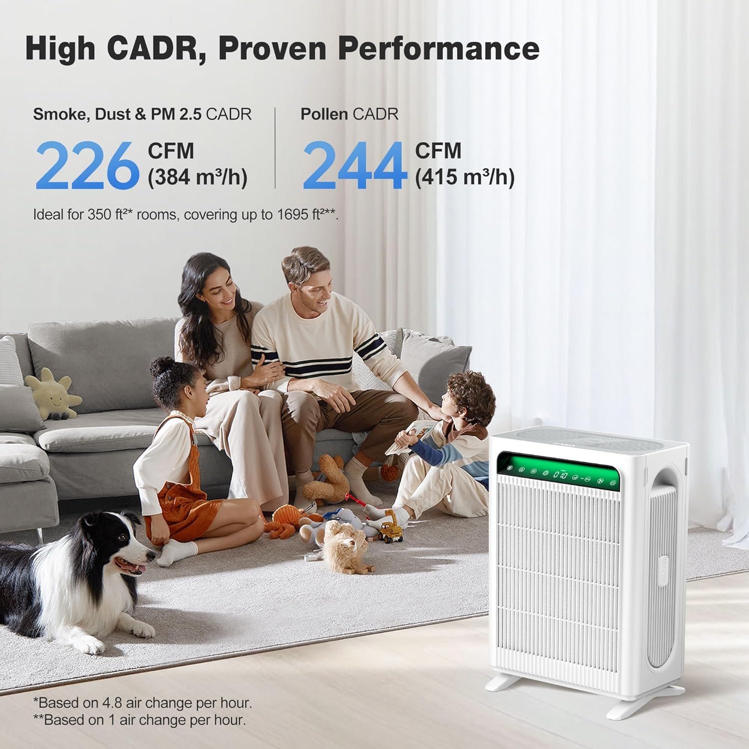 𝐇𝐢𝐠𝐡 𝐂𝐀𝐃𝐑 𝐕𝐚𝐥𝐮𝐞: This air purifier provides reliable performance with a Smoke/Dust/PM2.5 CADR of 226 CFM (384 m³/h) and a Pollen CADR of 244 CFM (415 m³/h), ensuring effective and high-speed air purification for your home.