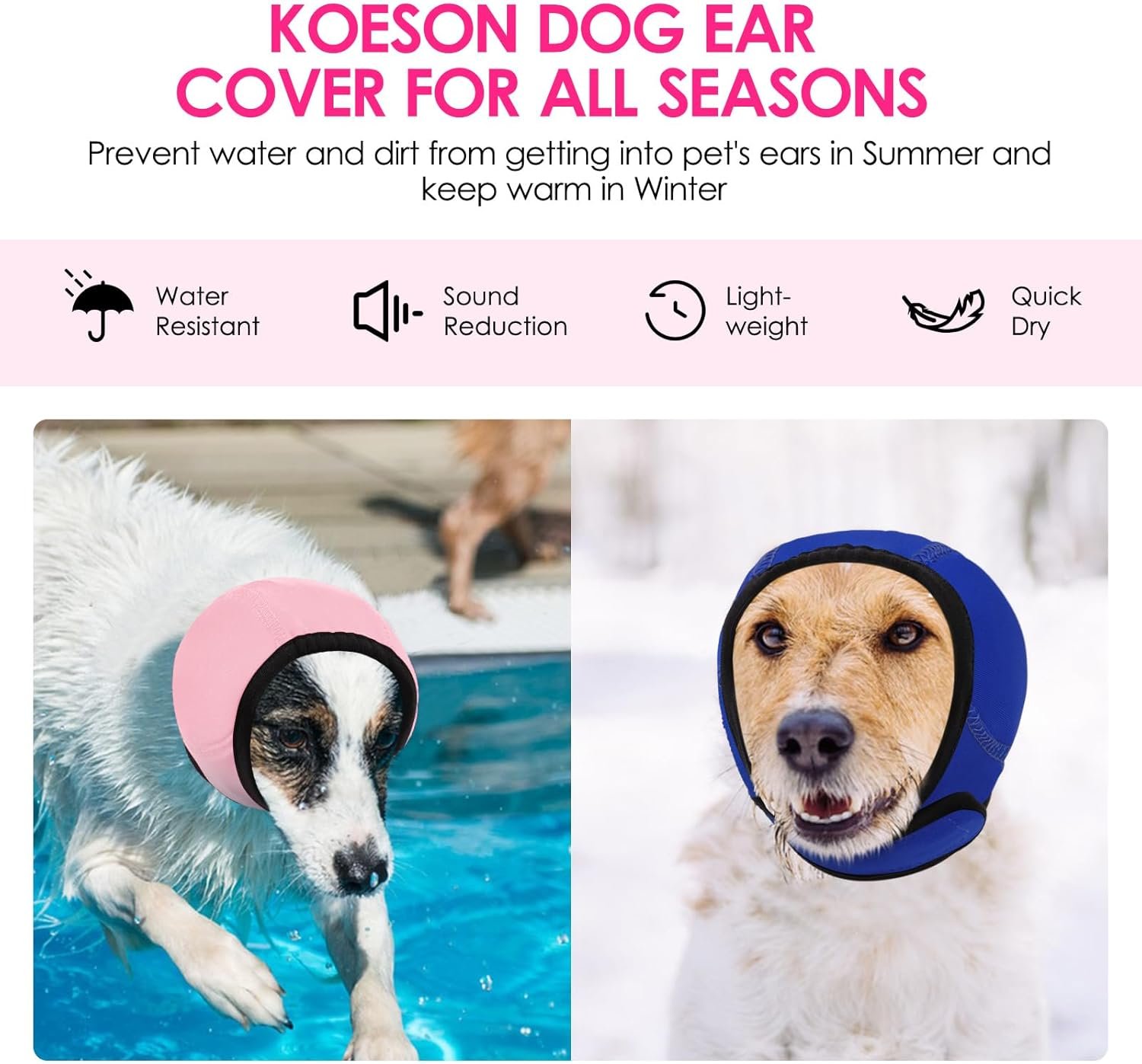 Waterproof Dog Ear Wraps: KOESON dog snood ear protector is water-resistant, preventing water and dirt in water from getting into pet’s ears. Ideal for grooming, bathing, swiming, Summer pool party or outdoor use, keeping ears dry and hygienic