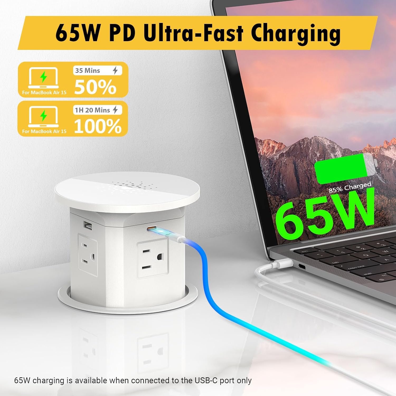 PD 65W USB C Fast Charging – Pop up outlet for countertop provide fast charging for laptops. The USB C ports can quickly charge laptop and mobile phone simultaneously with a maximum power of 65W and intelligent power distribution. Single USB C1/C2 Output: 65W Max, 5V/3A, 9V/3A, 12V/3A, 15V/3A, 20V/3.25A.