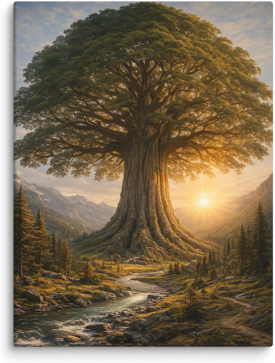 ArtHalls Gallery Majestic Tree Landscape Canvas Wall Art, Nature Mountain Sunset Scene Print
