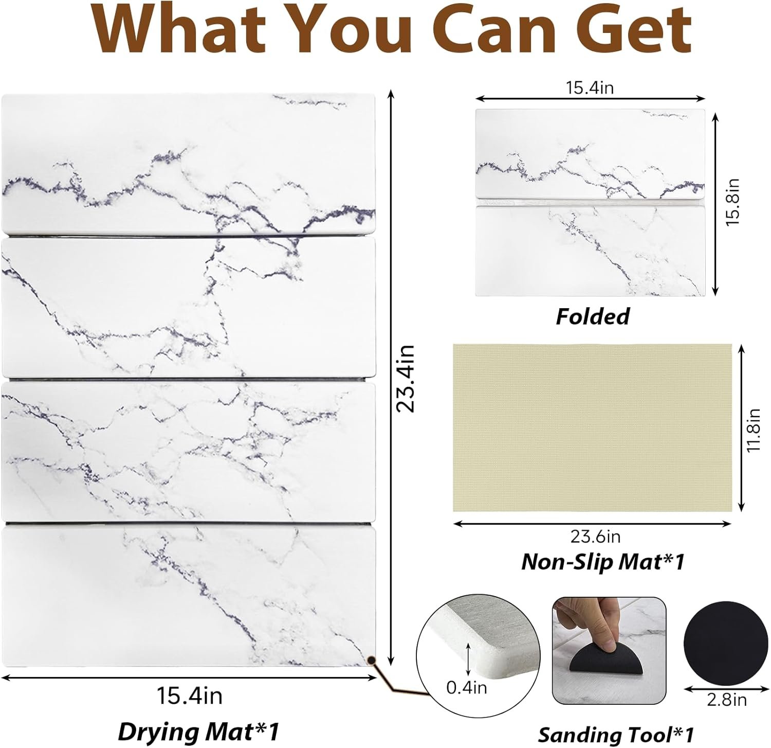 【What You Can Get!】Our quick dry stone mat contains:Large Stone Dish Drying Mat x 1, 23.4″(L)×15.4″(W), Sanding Tool x 1, Non-Slip Mat x 1, Instruction x 1.