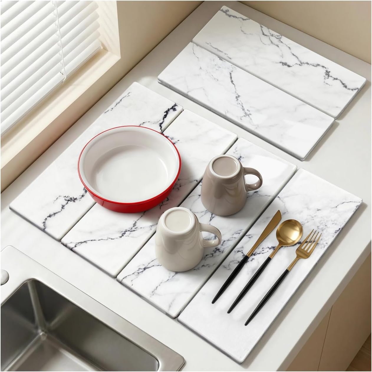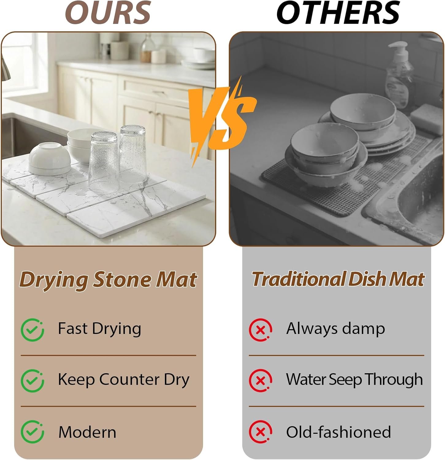 【Food-Grade Material Newly Upgraded—Cleans More Easier than Other Products!】 The dish drying stone stains occur. It offers enhanced performance for effortless cleaning—simply wipe the quick dry stone mat kitchen with a damp cloth or polish it with sandpaper for light stains, or treat localized spots with vinegar and baking soda to easily remove marks and restore the dish drying mat’s fresh look.