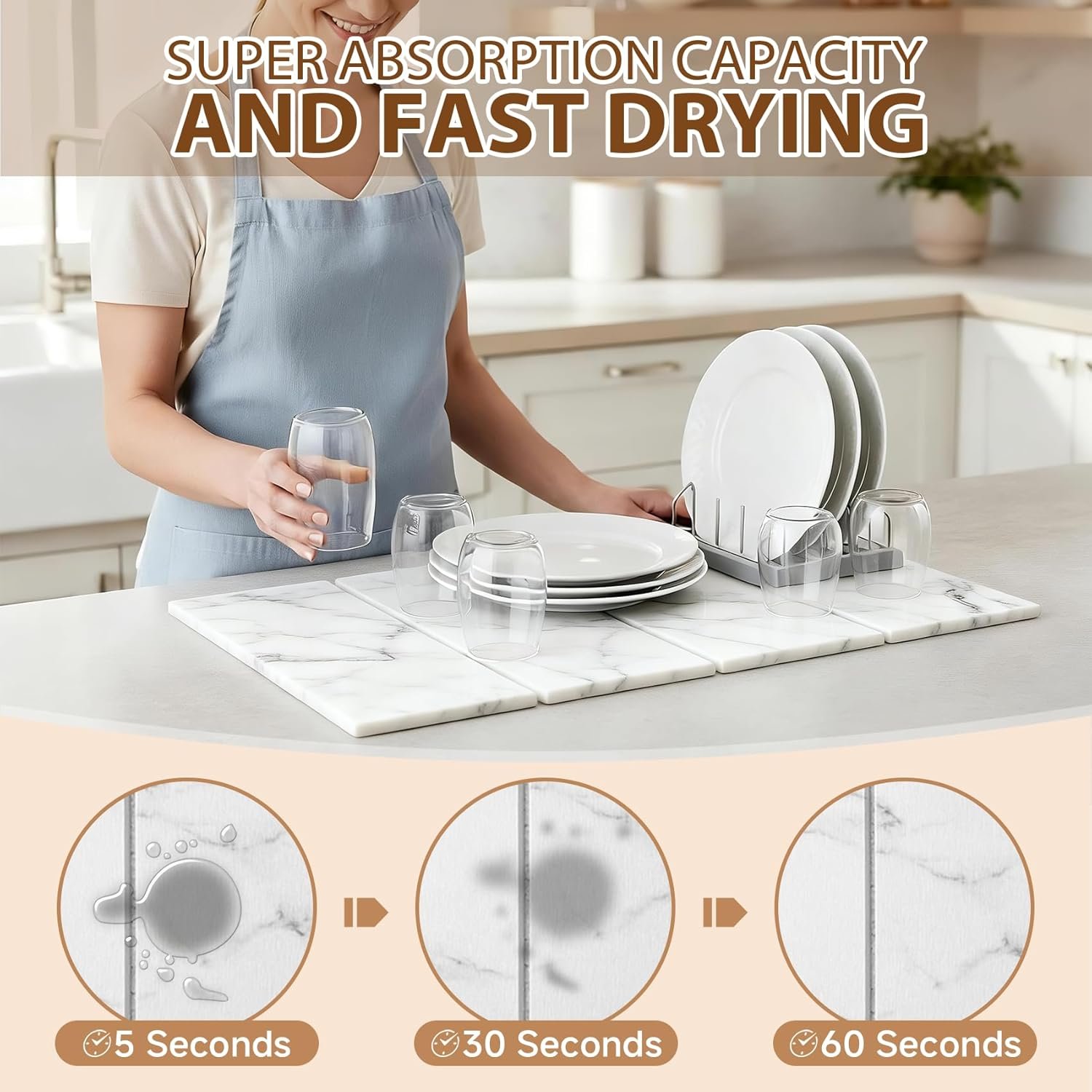 【Bigger Size!】Our stone drying mat for kitchen counter covers your entire kitchen countertop for a one-stop solution to dishwashing and water absorption! It’s measuring 23.4″×15.4″ when unfolded. You can easily store our dish mat drying kitchen mat in drawers or kitchen cabinets when you don’t need it.