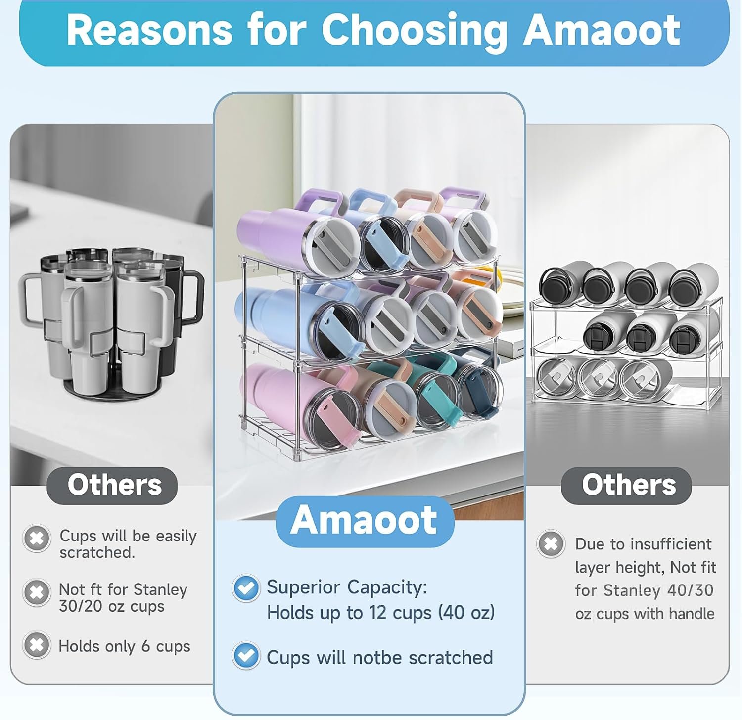 Stackable Space-Saving Design: This cup organizer for kitchen cabinets features an independent, stackable design with stable connections, allowing for easy disassembly and reassembly. It can be customized to fit different cabinet spaces or bottle sizes as needed. This tumbler organizer makes storage more flexible and personalized, effectively utilizing vertical space to increase kitchen storage capacity, and giving your home and kitchen a more organized and brighter appearance