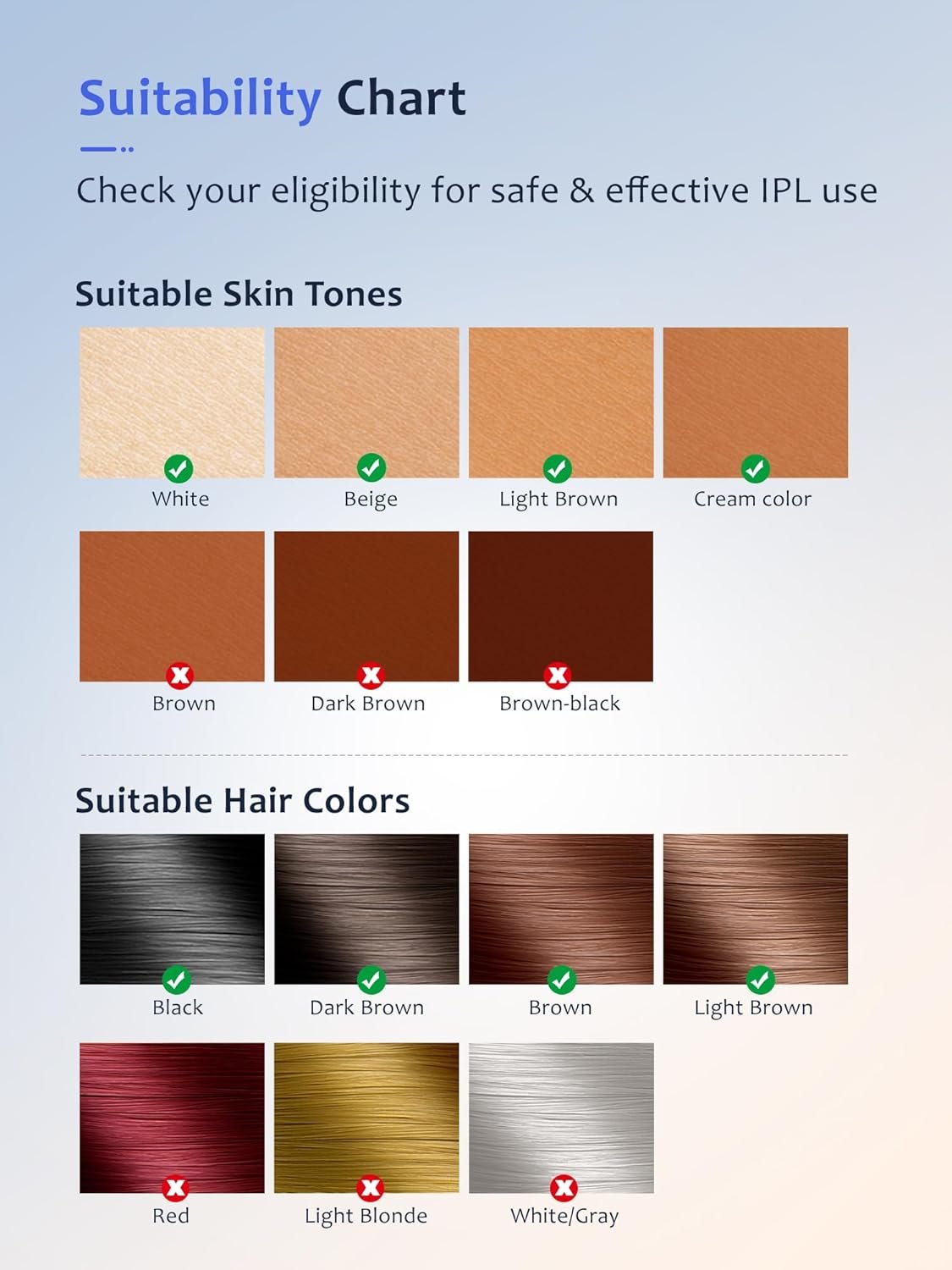 ❄️ Please check whether your skin tone and hair color are suitable for this device. Refer to the provided chart or contact our customer support for guidance.What’s Included:IPL Hair Removal Device,Goggles,Shaver,User Manual,If you are not satisfied with the product or our service, please reach out to us immediately.
