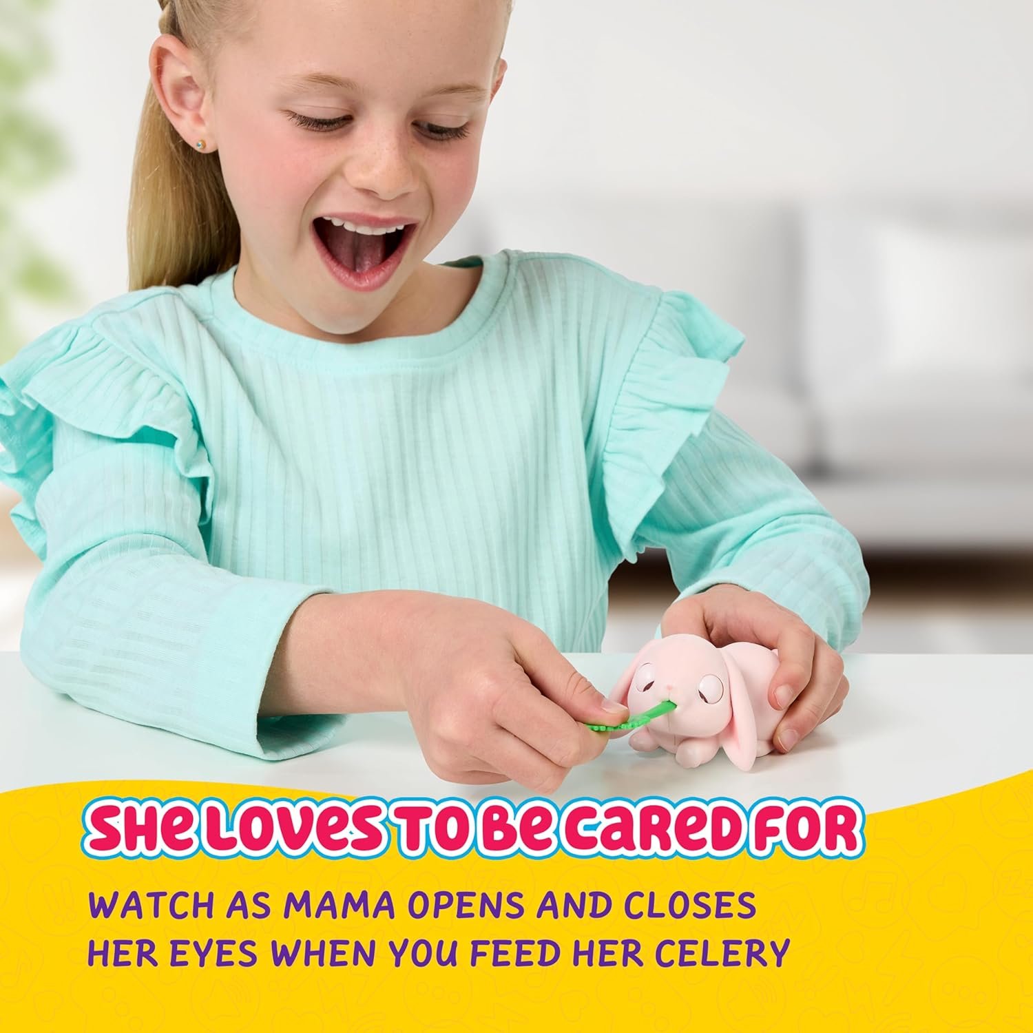 Interactive Mini Mama Bunny: Nurture your mama toy rabbit for kids by patting her, feeding her, and brushing her to make her heart light up in joy – these interactive bunny toys for kids are ideal for nurturing play for ages 4 and above