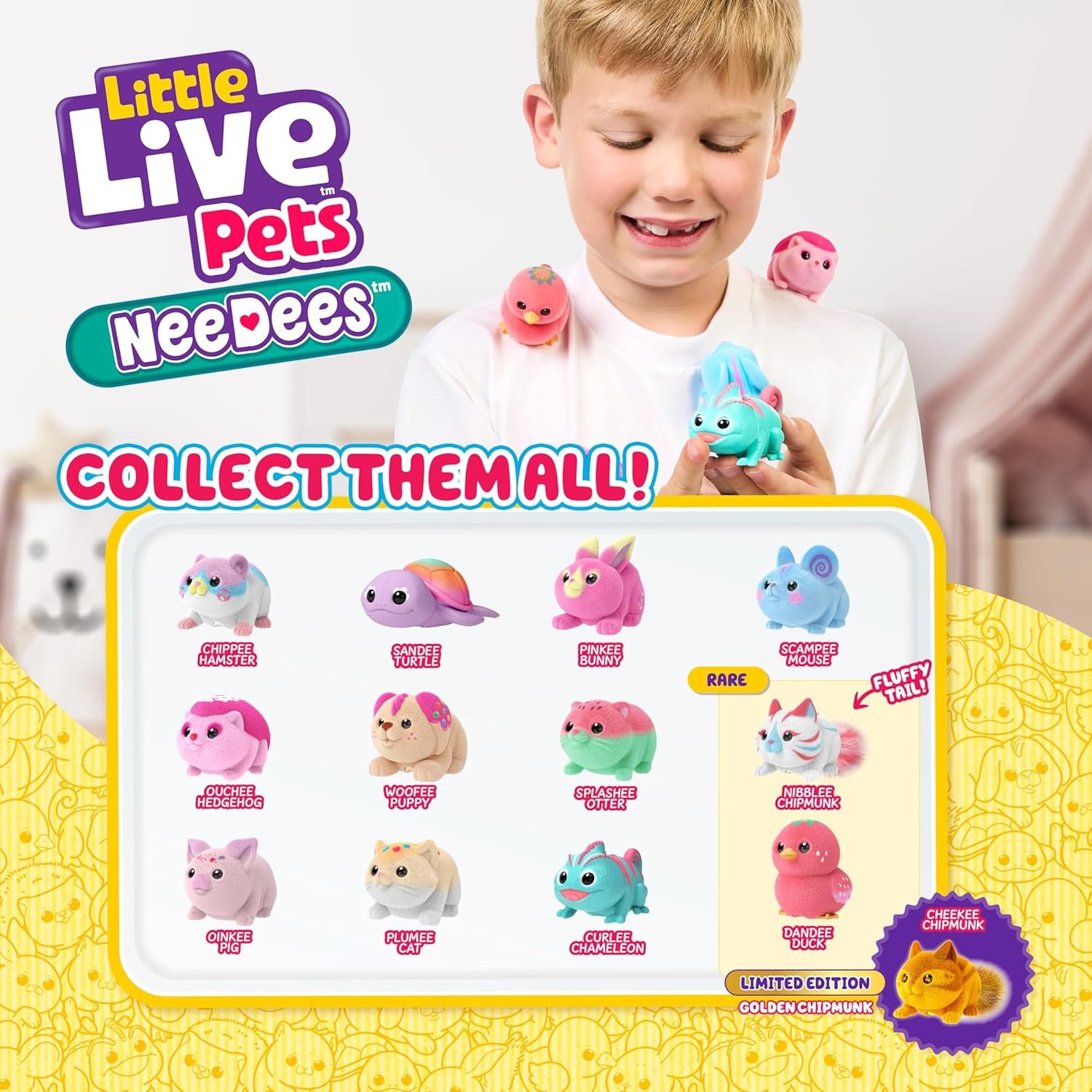 Moose Toys Little Live Pets Needees Interactive Pet Collection: Turn everyday moments into unforgettable adventures with our candy themed Little Live Needees plush toys. Each pocket-sized toy pet is perfectly designed to clip onto backpacks, belt loops, or jackets, so your child can carry their favorite NeeDee wherever they go. Whenever you hear the “Needee Needee” call of our interactive pet toys for kids, in 50+ distinct tones to convey various moods – happy, sad, cold, sleepy, hungry, and more, respond quickly to play with these soft, furry toys. With lifelike blinking eyes and evolving behaviors, our Needees pet toy for kids engages curious minds and encourages nurturing play as kids learn to interpret their pet’s signals and strengthen their bond with every interaction. Tap the button on the lower back of the interactive stuffed animal to reveal your current care score and challenge yourself to reach the highest level—do so, and your Little Live Pet NeeDee will delight you with a special song! Featuring irresistibly soft, candy-colored flocked fur, the collection of plush interactive toy figures consisting of 13 adorable characters, including the elusive Limited Edition Golden Cheekee Chipmunk is perfect for gifting or collecting.