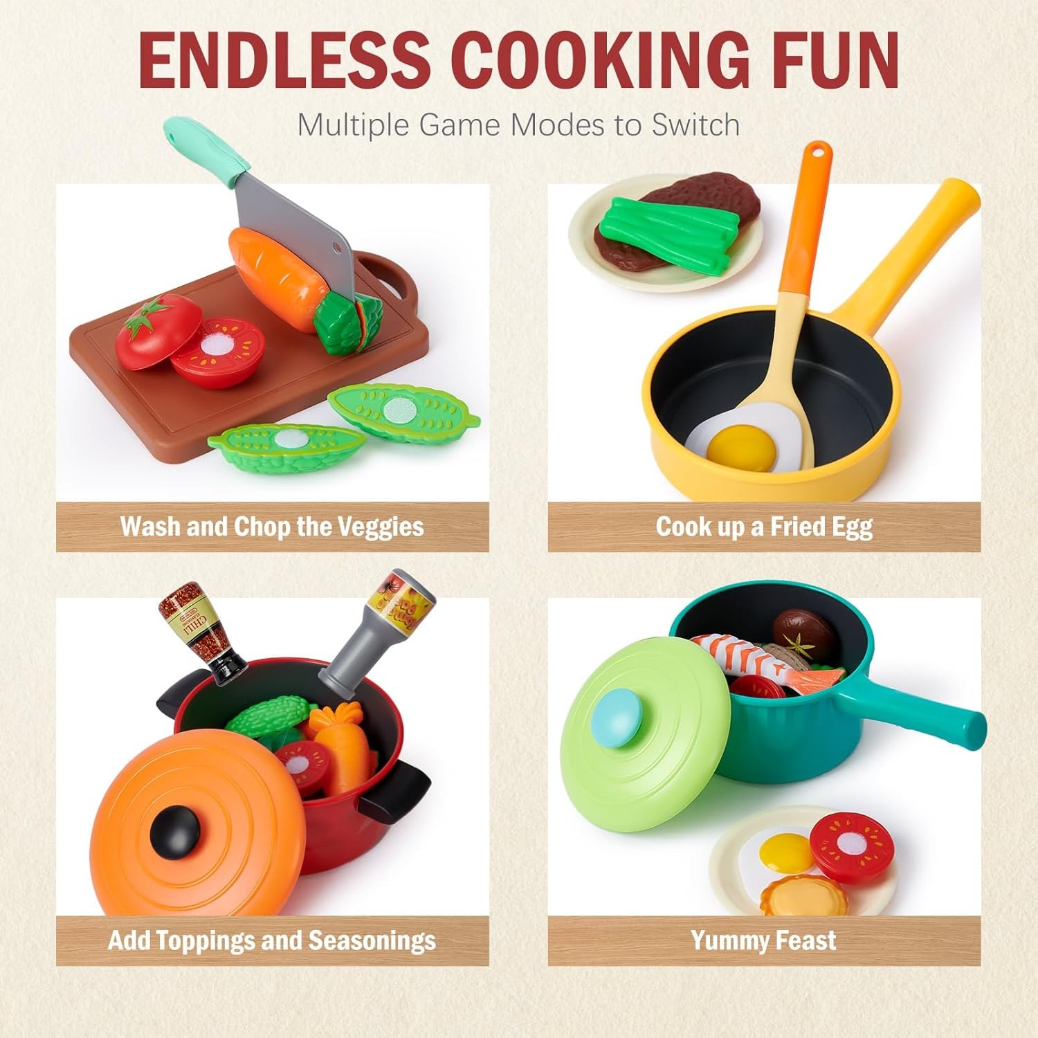 Learn While Having Fun: These play food sets aren’t just for play—they’re a “growth helper”! Bond with your child through pretend play for toddlers 3-5 as they “cook” for you, or let them share play kitchen food with friends as they build social skills. The “chopping” motions boost fine motor skills, making this kids kitchen set a smart choice for meaningful play. It also works with other play kitchen sets for kids ages 4-8, so you can expand their collection of toy food anytime!
