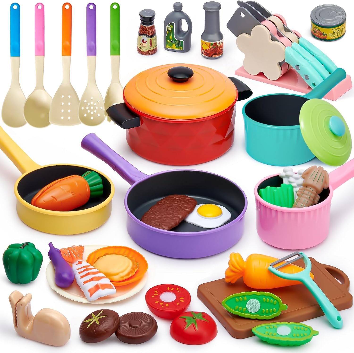 Superior Quality & Thoughtful Design: This entire toddler kitchen set is made of excellent quality ABS plastic, every piece is carefully crafted: it’s shatterproof and durable, while also protecting little ones’ delicate hands.And cleaning is a breeze—just wipe down the play food or rinse the pots and pans.The cookware looks just like real kitchen pots and pans, with an authentic feel that’s easy for kids to use. Plus, its rich, vibrant colors grab kids’attention quickly.