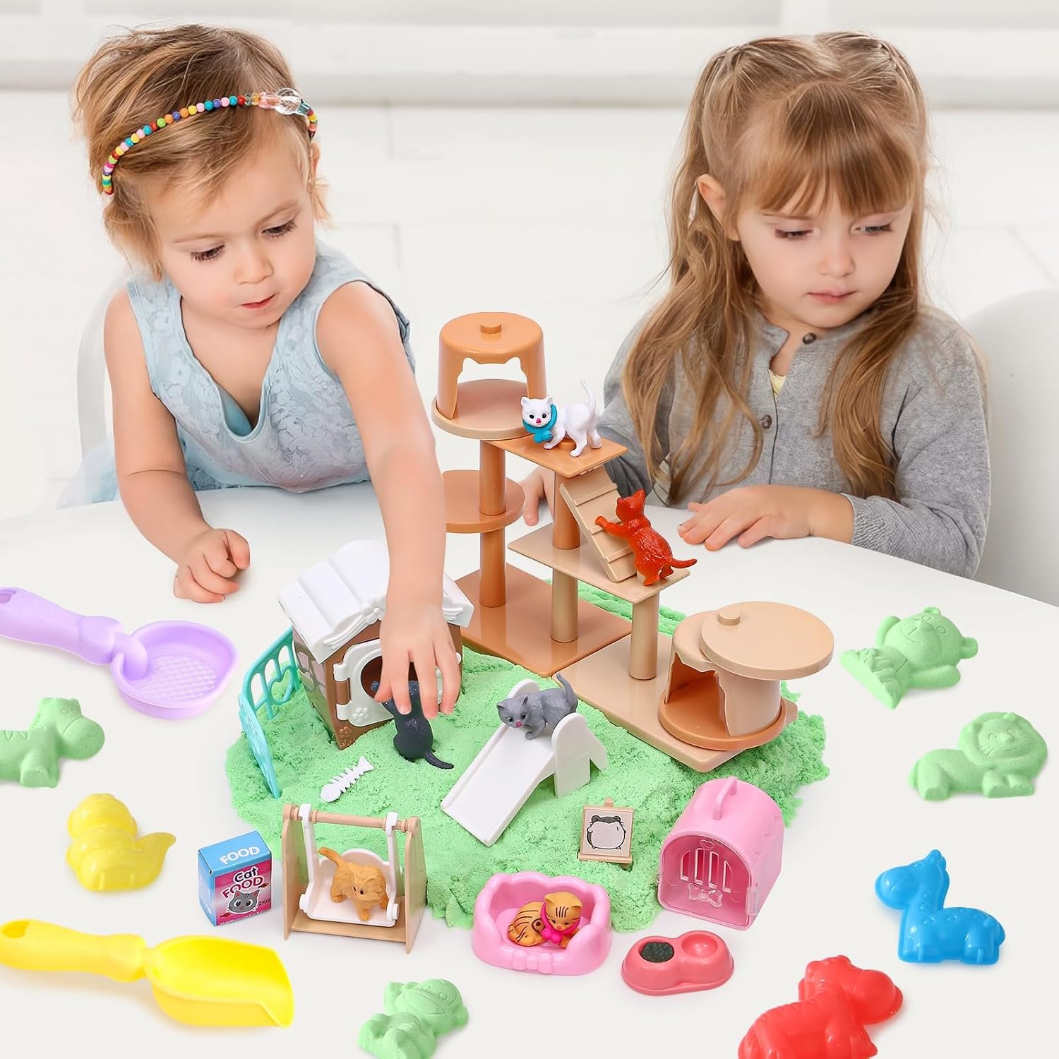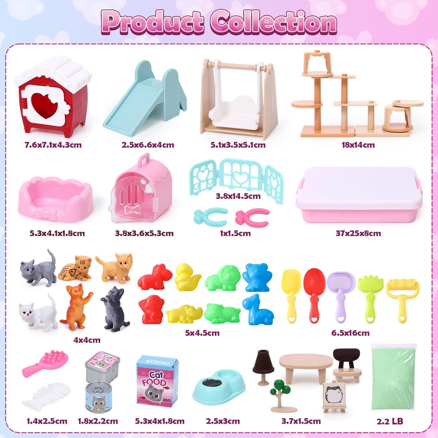 【Super Luxurious 47 Pcs Cat Sand Playset】—We have added 8 animal sand molds and 5 sand tools to this sand playset. Now this toddlers play cat sand playset includes 2.2 lbs sand+sandbox+8*animal sand molds+5*sand tools+cat food+cat house+cat beds+slide+swing+kennel+food bowls+bones+fences+6 random cats and an exquisite box. Let your kids to realize dream of taking care of a pet. Your kids will have much fun in it