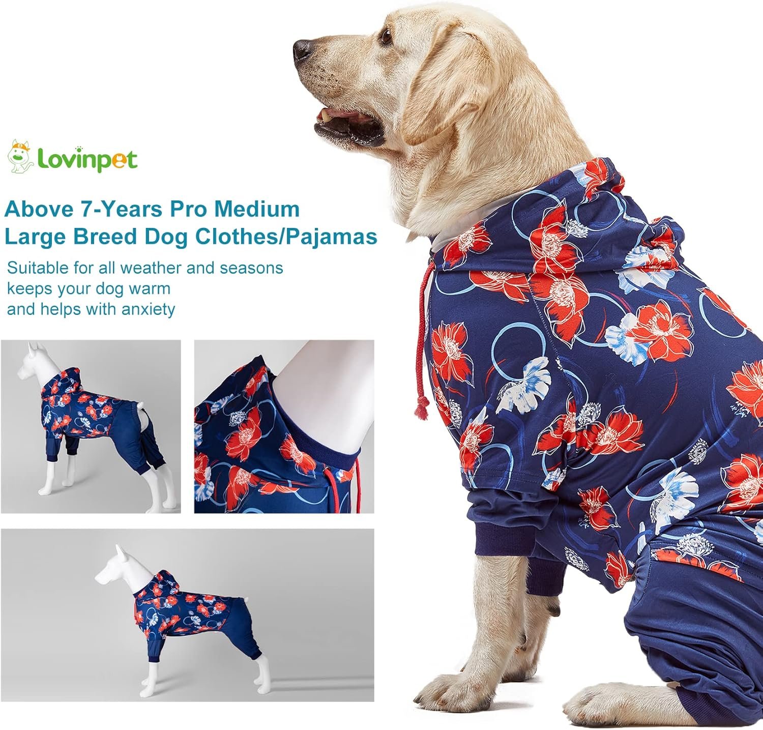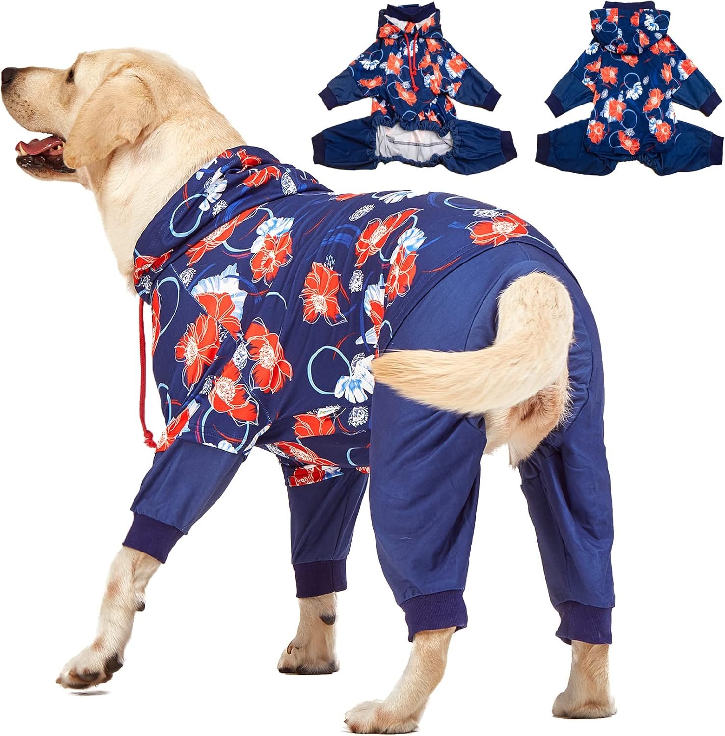 【Adjusted Drawstring design】 This big dog pjs design with hoodie and puff floral print navy/red prints, special designed with unique stitching like two-piece design, your dog will definitely become particularly fashionable when wearing it