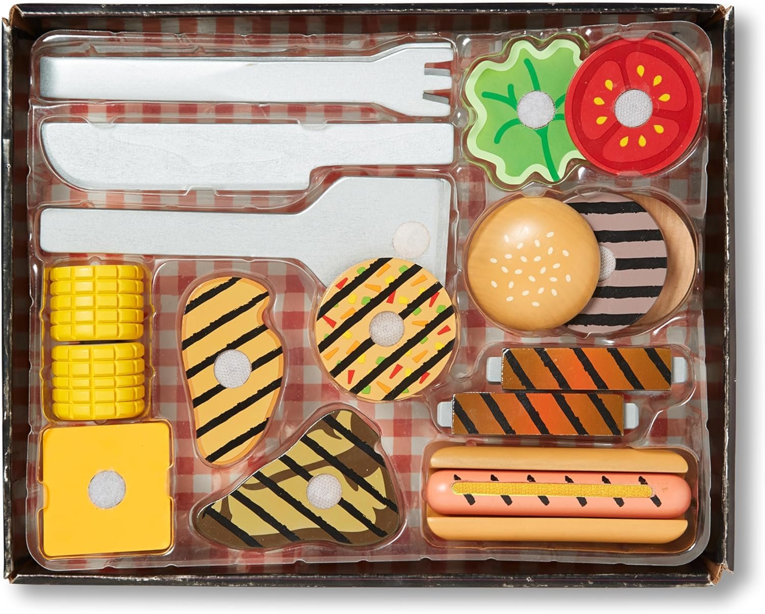 All the Fixins Included: This 20-piece table-top BBQ set comes with double-sided food toys (uncooked on one side, cooked on the other), buns, toppings, utensils, and a checkered serving mat