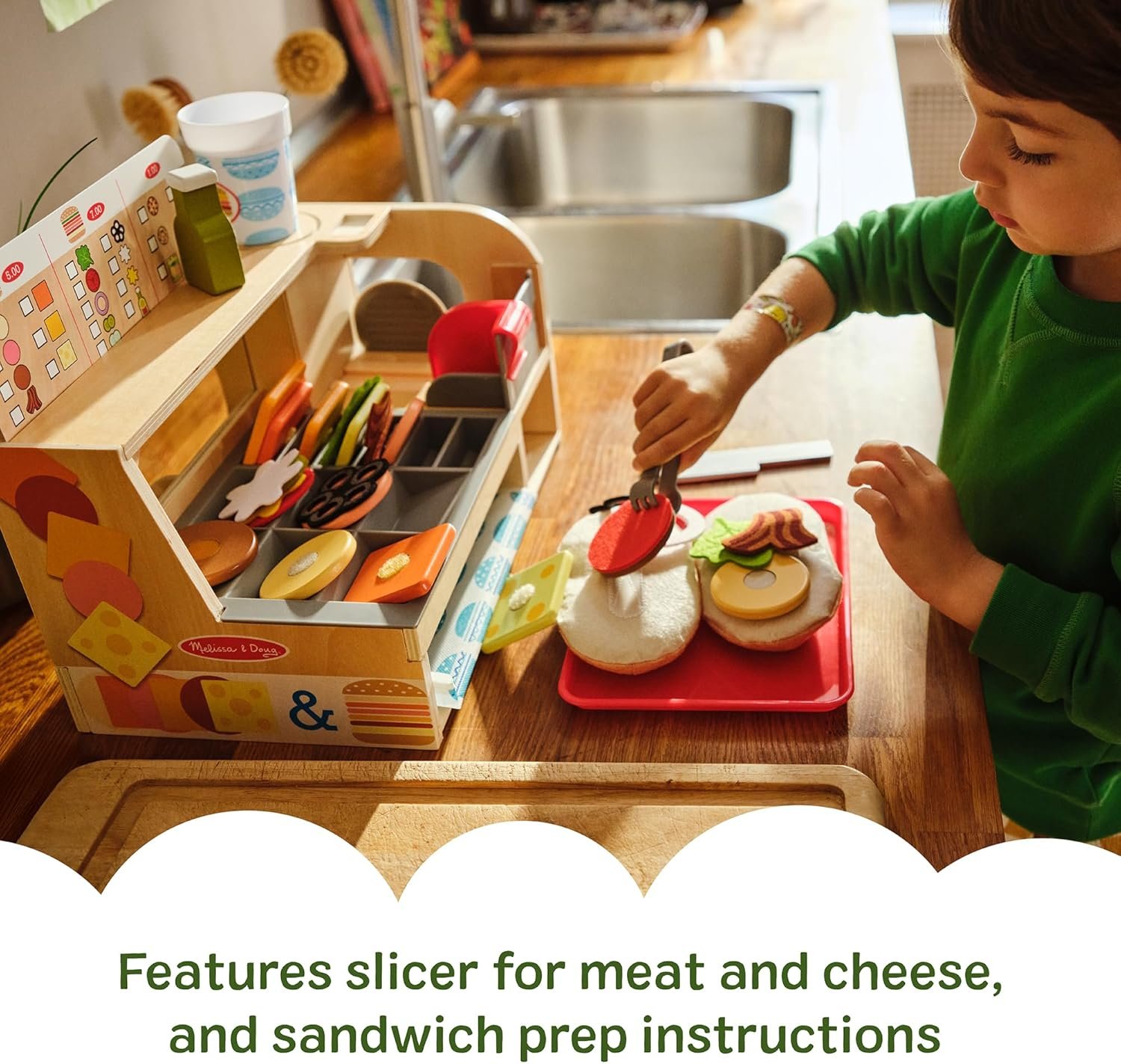 Serve up deli-fresh fun with the Melissa & Doug Wooden Sandwich Counter, kids kitchen playset! Young chefs can slice, stack, and serve custom sandwiches with 52 pretend play kitchen toys, including wooden meats, cheeses, and dressing bottle, a felt sandwich roll and toppings—plus chips, cookie, and a drink cup. The sturdy wooden deli counter also features a working slicer, a double-sided sign with menu and sandwich prep instructions, and play money to pay for each order. It’s a deliciously fun way to build counting, sorting, sequencing, and fine motor skills, with premium quality wooden toys for toddlers that inspires imaginative storytelling play.
