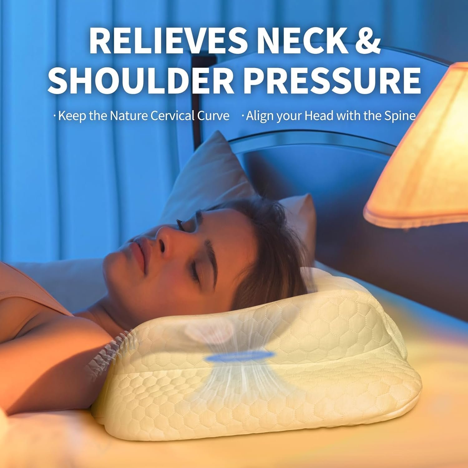 Ergonomic Cervical Support for Neck Pain Relief — Designed with a contoured butterfly shape and central airflow hole, the Pozico neck pillow promotes natural spinal alignment and reduces neck and shoulder tension for side and back sleepers, helps you wake up feeling less stiff.