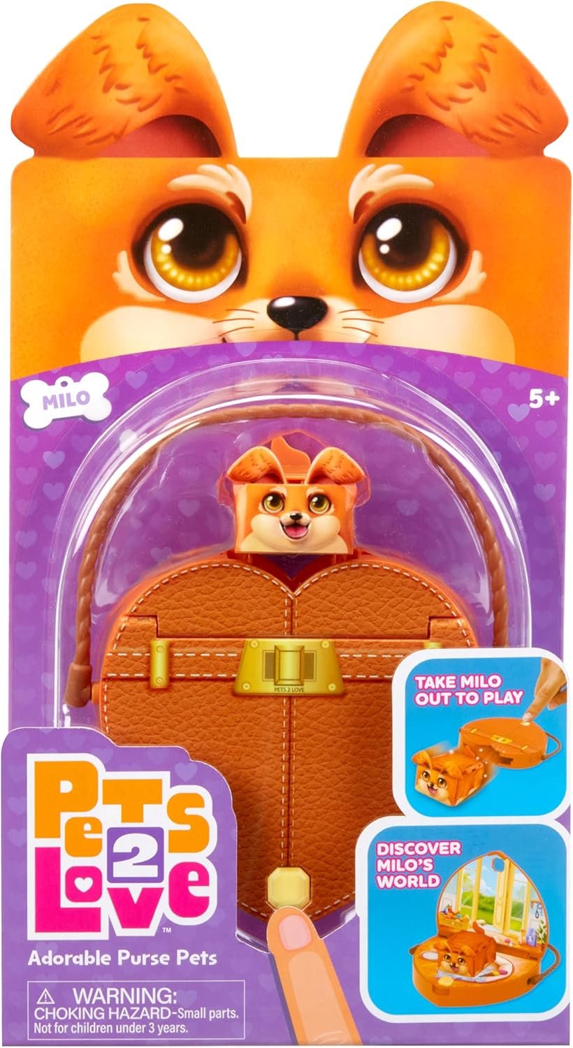Say hello to Pets 2 Love – Milo, the energetic dog who’s always up for playtime. Milo travels in a stylish heart-shaped animal purse that’s as fun as it is functional. Press the button to make Milo pop out and greet you and lift the top for a peek into his cozy hideaway. When it’s time for a walk, the purse strap becomes a leash so you can bring your animal purse friend along for the ride. This purse dog toy set includes Milo, his heart-shaped toy pet carrier, and a leash—perfect for inspiring imaginative adventures. Ideal for ages 5 and up.