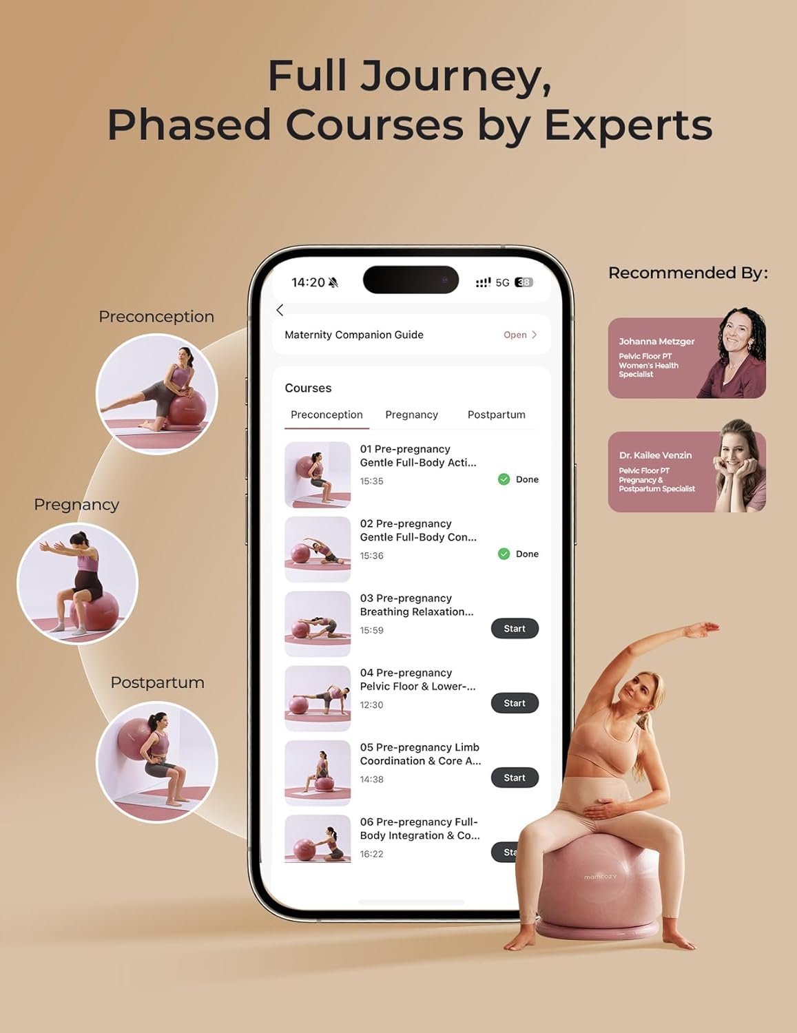 Stage-Based, Full-Journey Courses in the App: Approachable videos developed by maternal movement specialists guide moms safely from preconception to postpartum recovery. Designed for simplicity and clarity, these courses empower even new users to practice confidently at home with Momcozy pregnancy ball.
