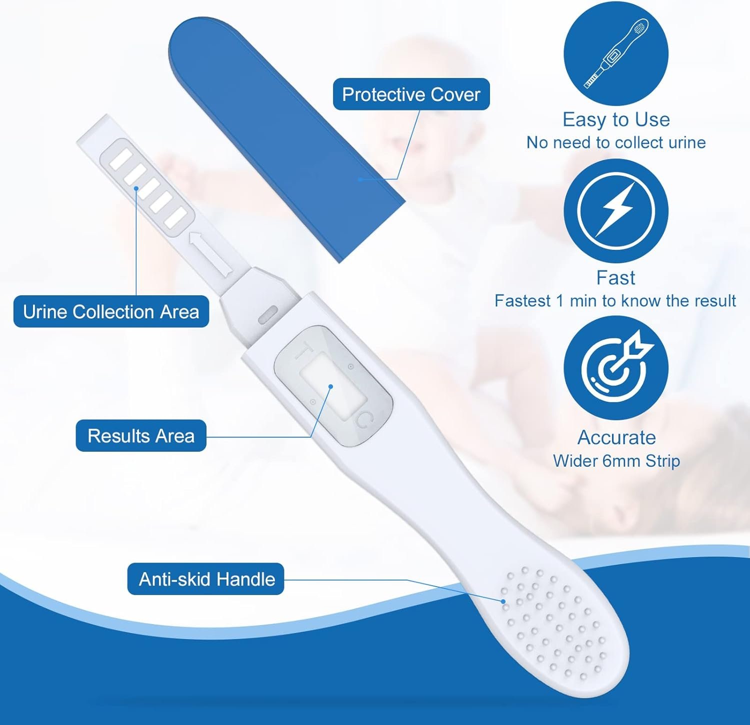 Easy Operation: With the MOMMED pregnancy test, there’s no need to collect urine separately. Simply hold the absorbent tip in the urine stream for 5 seconds and lay the pregnancy test flat for faster results within 1 minute.