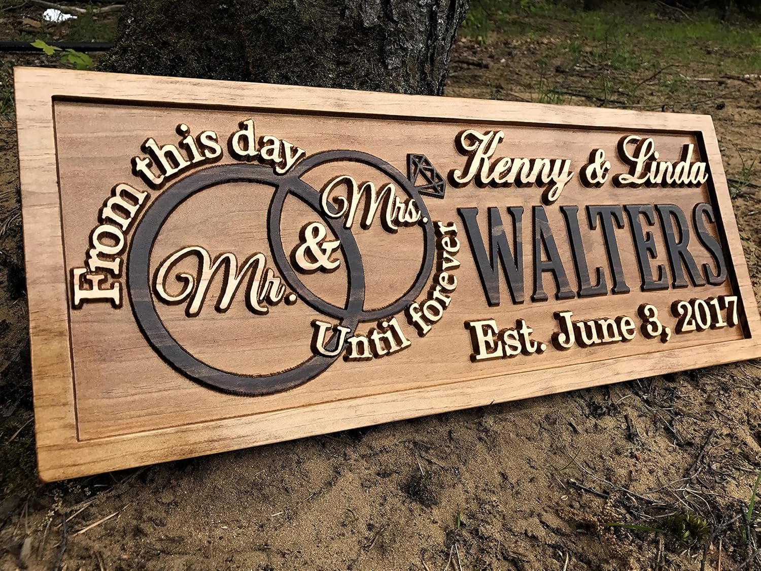 Personalized Wood Carved Name Sign with 3D Wedding Rings