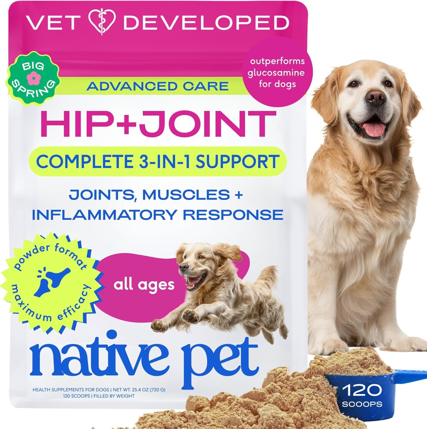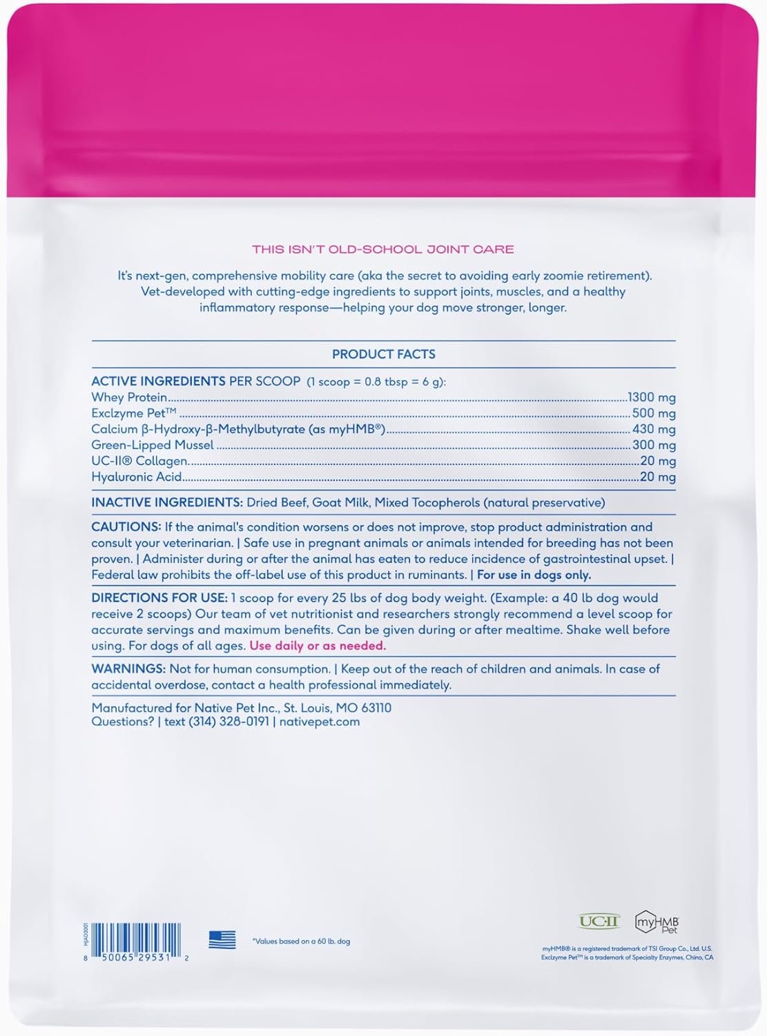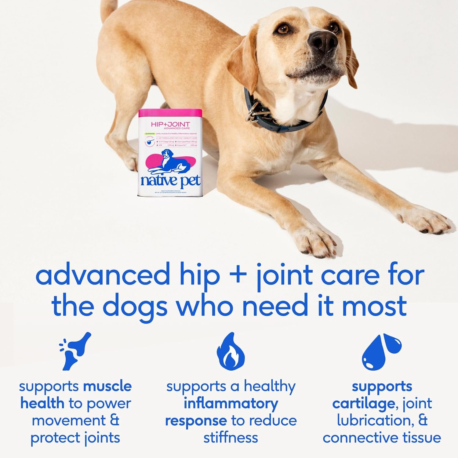 Native Pet Hip & Joint Advanced Care Dog Joint Supplement Powder for Mobility & Movement Support, Joint Supplement for Dogs with HMB, UC-II Collagen, Green Lipped Mussel & Hyaluronic Acid-120 Scoops
