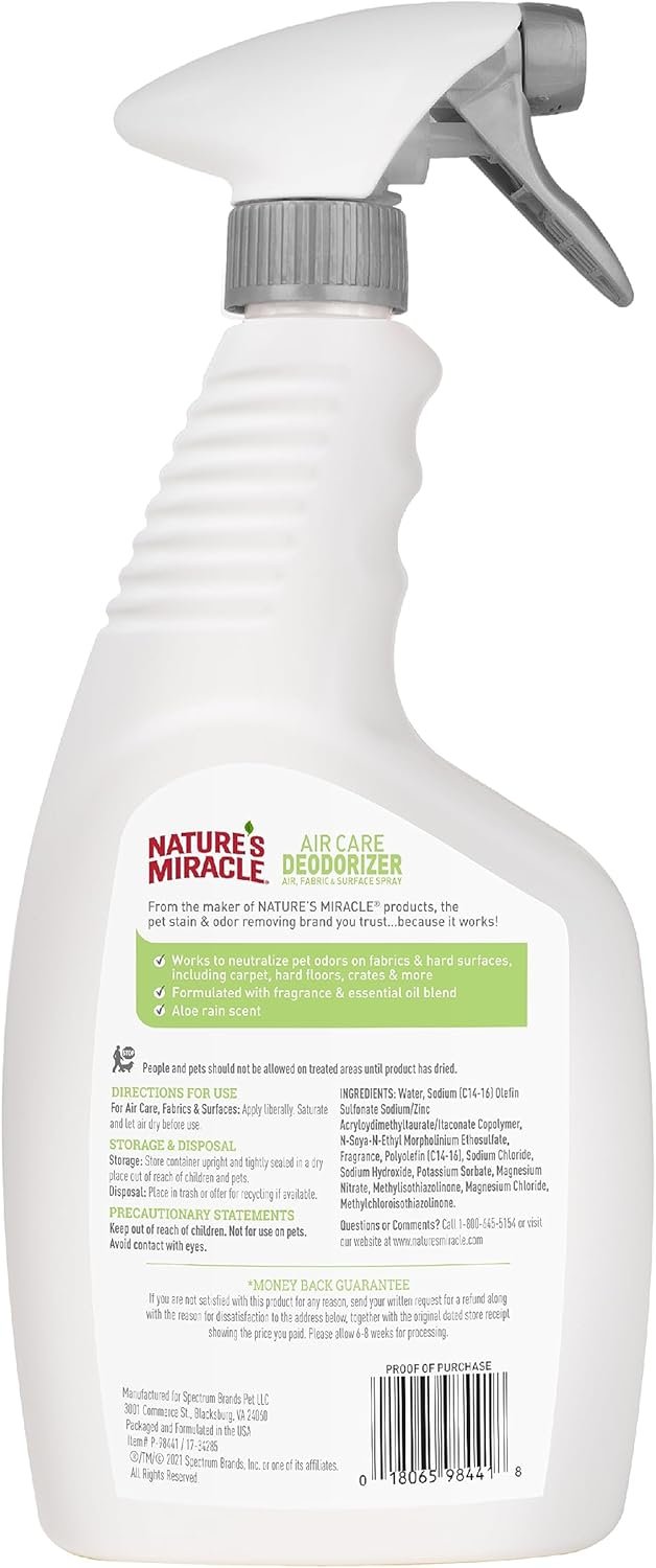 Nature’s Miracle® pet stain and odor removers have been a trusted brand for pet mess cleanup for 40 years. Nature’s Miracle stain and odor removers, virus disinfectants, training aids, litter and waste management and grooming products offer solutions for life with pets, from everyday messes to the toughest cleanup jobs. Whatever pets do, you can trust Nature’s Miracle products to undo. Sometimes, owning pets means unwanted odors lingering around your home. When things start to get smelly, Nature’s Miracle® Air Care Deodorizer works to neutralize pet odors on fabrics and hard surfaces, including carpet, hard floor, crates and more. Unlike many products that may simply mask unpleasant pet odors, this pet odor controlling solution works to break down and help destroy tough pet odors on contact. Plus, it’s formulated with a fragrance blend containing essentials oils to leave a pleasant aloe rain scent. Spray in the air or on surfaces to help neutralize pet odors on fabrics and hard surfaces, including carpet, hard floor, crates and more spaces throughout the home. Safe for pets and home when used and stored as directed.