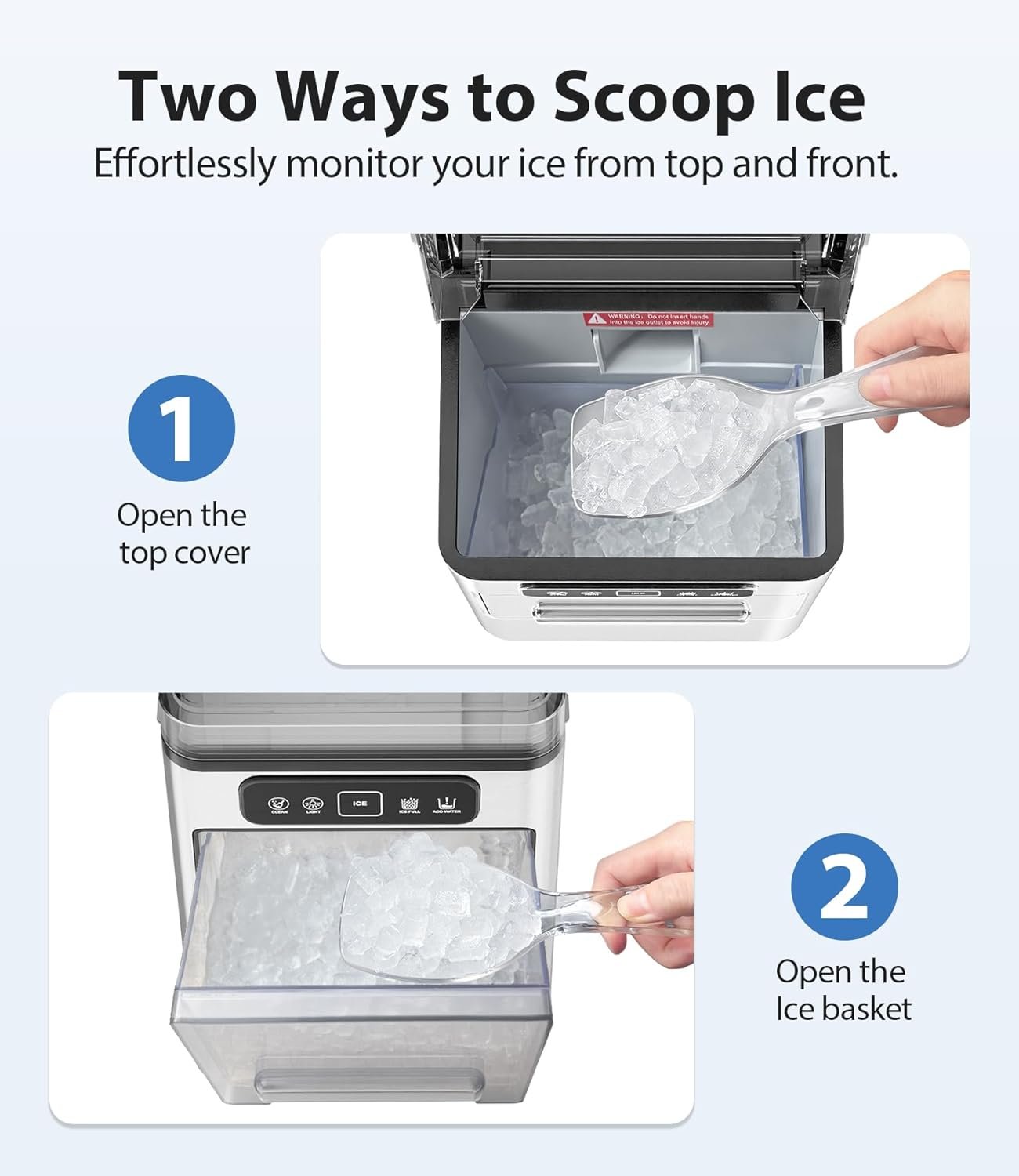 5-Minute Ice: Ready in Minutes: Experience quick and efficient ice production with SenCre high-performance ice maker. Equipped with a 1 L water tank and a reliable compressor, it can produce up to 40 lbs of ice per day. Your first batch of soft, fresh ice is ready in just 5 minutes. Ideal for family gatherings or daily use, this ice machine provides a steady supply of chewable ice without long waiting times.