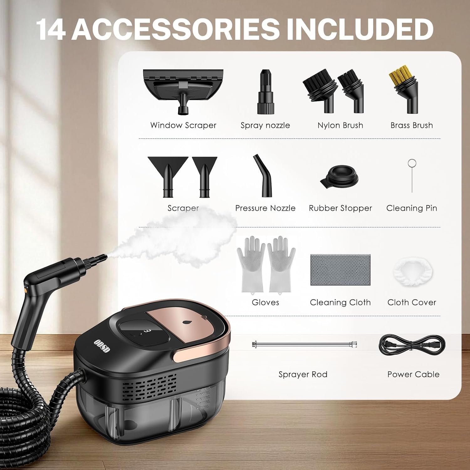 【16 Attachments for Total Home & Car Use】Includes specialized tools for home and car detailing: Tackle all areas with brushes, scrapers, and nozzles. This ODSD steam cleaner handheld deeply cleans tile, grout, windows, car seats, and pet areas with professional results. This steam cleaner handheld deep-cleans home, car interiors, kitchens, bathrooms, sofa, furniture and more.