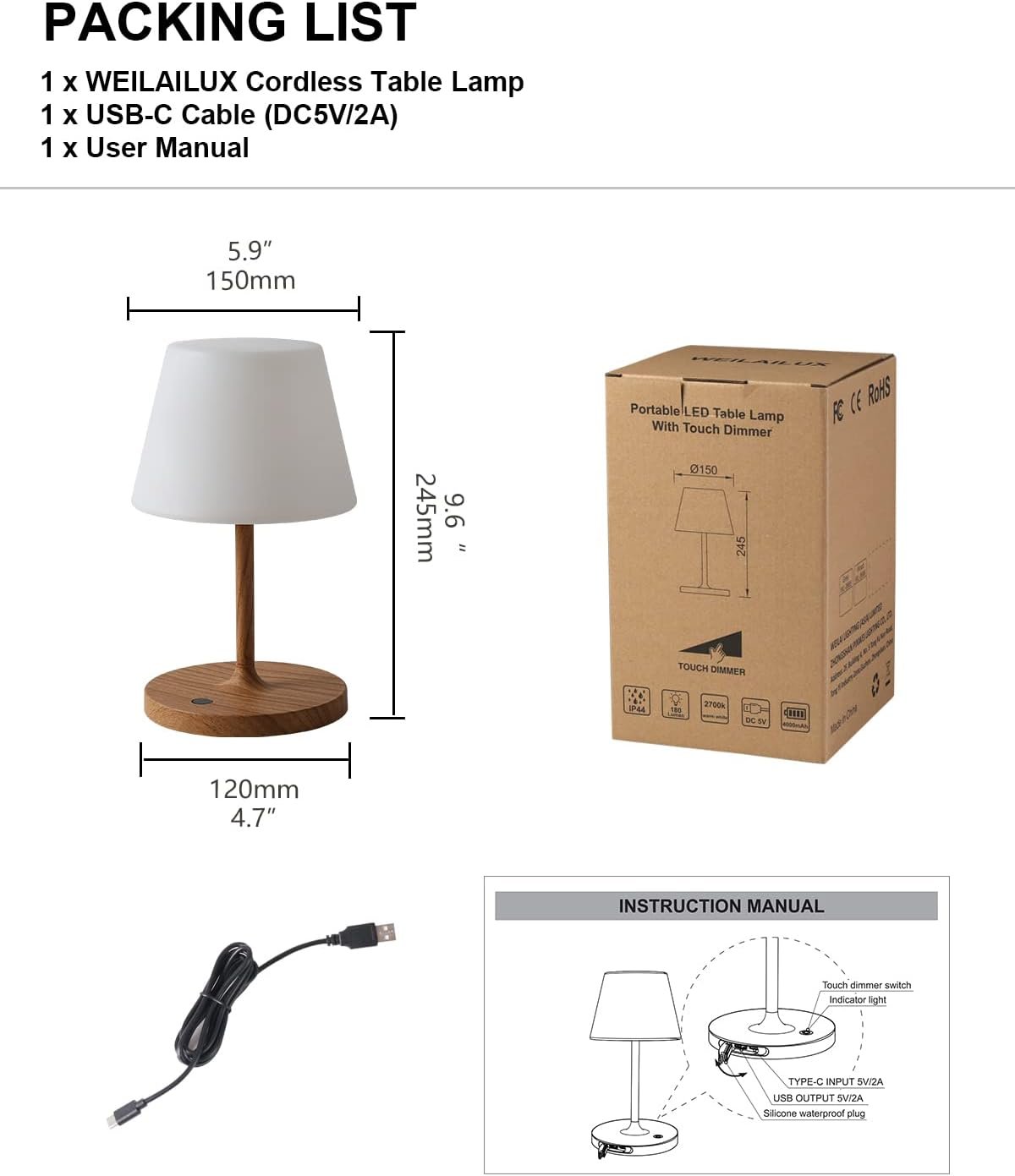 IP44 Waterproof Certified for Outdoor: Plastic PE lampshade with closed structure, matte powder coated casting aluminum alloy lamp body, strong rubber tap for protecting USB ports, silicone seal mounted under touch switch for preventing water leakage, all above made it a professional outdoor table lamp guarantee full functionality even when it rains. Besides, with 1kg weight it can be tilt proof during a sudden wind, it’s the ideal lamp for camping, patio, garden , kitchen, restaurant etc.