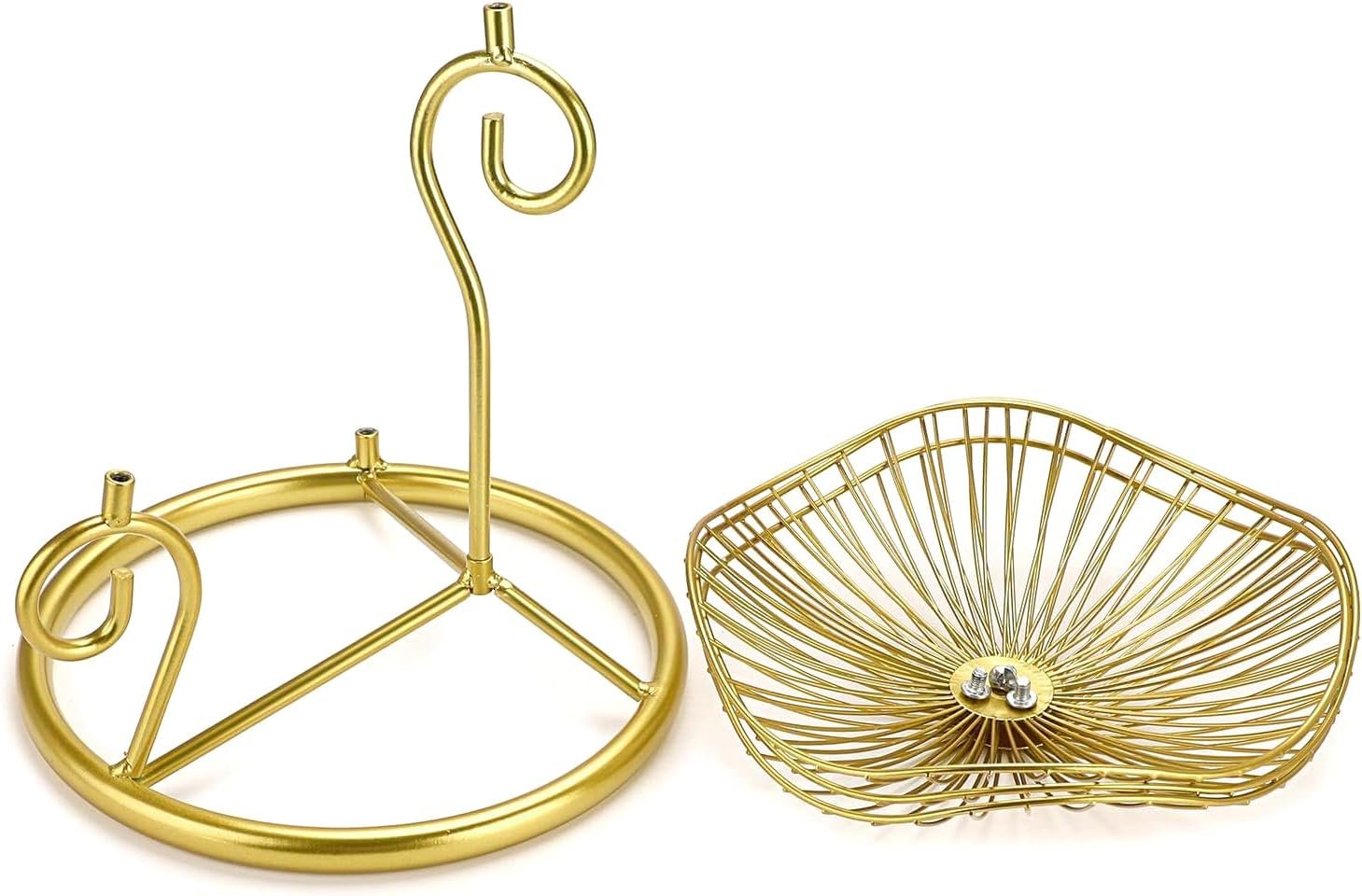 Material: IronColor: Golden ToneOverall Dimension (Height x Width): 34cm x 46.5cm / 13.4″ x 18.3″Opening Diameter of Each Fruit Bowl: 24cm / 9.4″Diameter of Base: 26.5cm / 10.4″Height from Base to Curved Part (Uninstalled): 26cm / 10.2″